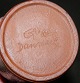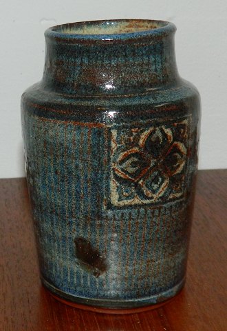 Vase in pottery by Gudrun Meedom (1915-2011). Covered with bluish glaze. Decoration on two sides! In good condition with no damage or repairs. Dark blue glaze defects seen on the side (see photo). Signed by the artist on the bottom. The vase is 13 cm high.
