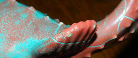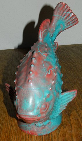 Figur i keramik af stenbider fra Peter Ipsens Enke. Dækket af en smuk rød og grøn Danit-glasur. Fremstillet i 1930´erne på Ipsen fabrikken i København. Fremstår i god stand uden skader eller reparationer. Har dog tre meget små glasurafslag. Èt ses på billed ! Fabriksmærket på bunden med Krone samt PIE. Stemplet er næsten dækket af glasuren. Figuren er 22 cm høj.