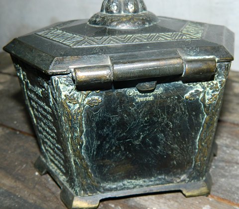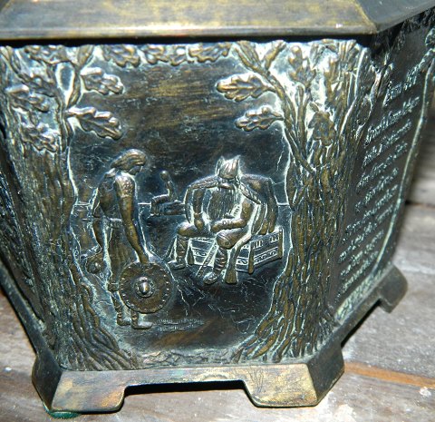 Vikings: Metal Casket (broncelignende) with motifs from the Viking Age and stone setting on top of the lid. In good condition. 13 cm high