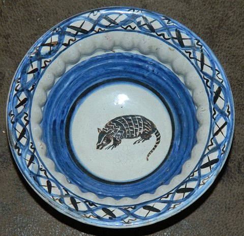 Hans and Grethe / Lars Syberg bowl in ceramic with decoration of armadillos. Made in the 1930s. Decorated by Grethe Jensen. In perfect condition. Handwritten factory mark and artist signature on the bottom. H. 8 cm Top Dia. 18 cm.
