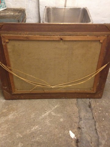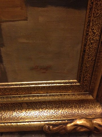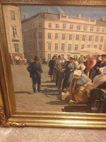 Maleri på lærred med motiv fra Højbro Plads. Malet af Søren Bjulf (1890-1958). På maleriet ses fiskekoner, postbud, smuk ung kvinde mænd og fruer. I smuk ramme i guldbelagt træ. I god stand. Mål: 94 cm x 122 cm