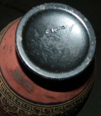 Lille krukke i terracotta med hanke. Fremstillet i slutningen af 19. århundrede. Fremstår i god stand. Bemaling dog med brugsslid. Fabriksmærket på bunden med "P. Ipsen". 11½ cm høj.