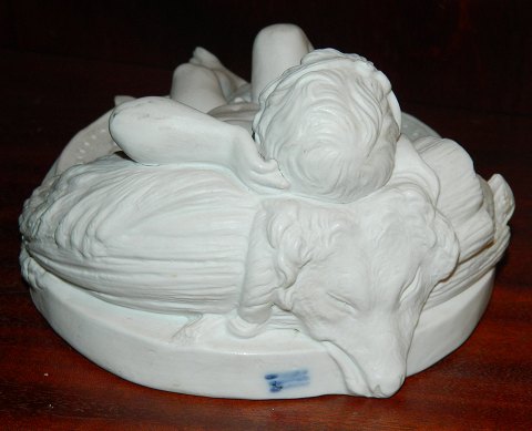 Figure in biscuit of the Sleeping King Skjold (Shield) as a child by the sculptor Th. Stein for Royal Copenhagen in the late 19th. century. The figure has a few cracks from the production one at the right ankle. No damage or repairs. Factory marks on the back of the base with the familiar three waves of Royal Copenhagen. Dimensions: 8½ cm high and 19½ cm long. From Nordic Mythology about Legends of King Skjold:: According to the saga of shield kids were Skjold child of Odin and Rind. He was King of Zealand and ancestor of the Danish Kings.