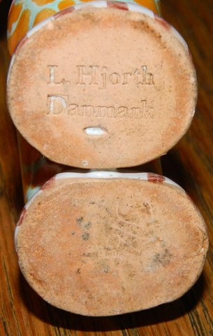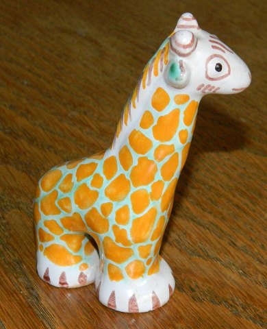 Figur af bemalet giraf fra Lauritz Hjorth, Rønne, Bornholm. Fabriksmærket på undersiden med L. Hjorth, Danmark. To mindre skår/"nålestik" på undersiden hvor stemplet ses - "kl. 10.30" og "kl. 12.30" På undersiden uden stempel ses mindre revne "kl. 15.00". 9 cm høj