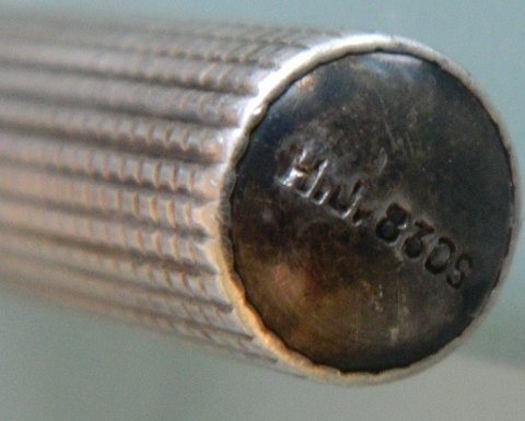 Proptrækker/oplukker i cylinder af sølv samt oplukker i tin med dekoration af due fra Just Andersen. Begge i god stand uden skader eller reparationer. Tin oplukkeren er 9½ cm lang.