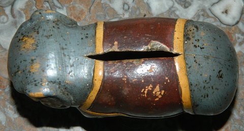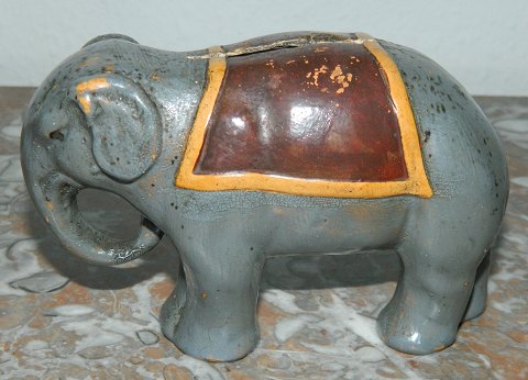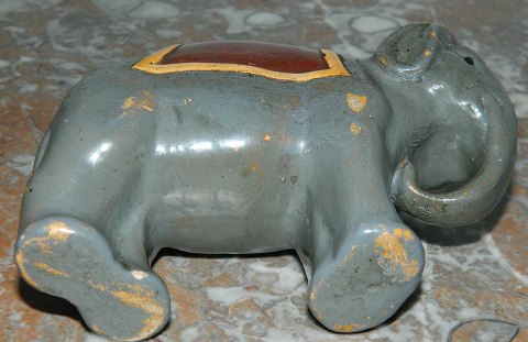 Painted figure of elephant money box from the 1930s. In good condition with some Wear of user - as evidenced by the pictures. No rejection or serious damage or repairs. 9 cm high and 13 cm long
