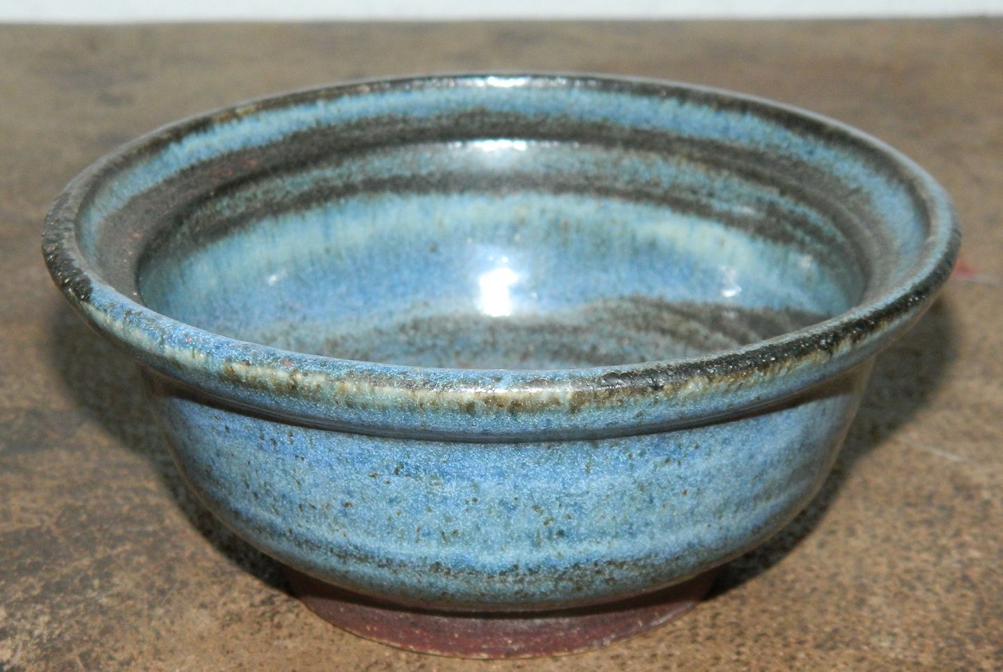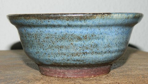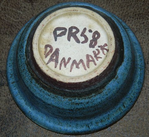 Bowl in ceramics partially covered by blue glaze. In perfect condition. Artist Signature PR and Production Year 1958 written on the bottom. Dimensions: High: 5½ cm Top diameter: 12½ cm