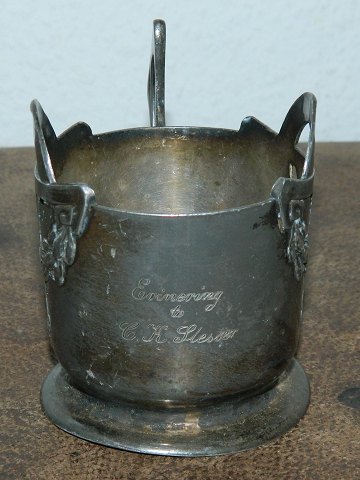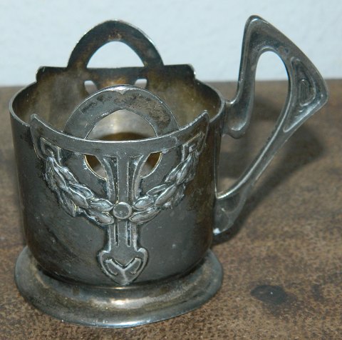 Rendyrket jugend fra Nederlandene: Holder til teglas i tin fremstillet i begyndelsen af 20. århundrede. Fremstår i god stand med almindeligt brugsslid. Fod lettere bukket. Ingen skader. Erindringshilsen indridset med navn på forsiden. Fabriksmærket på bunden med HOLLAND URANIA samt modelnummer 1245. Mål: 9 cm høj.