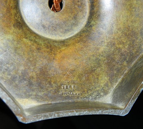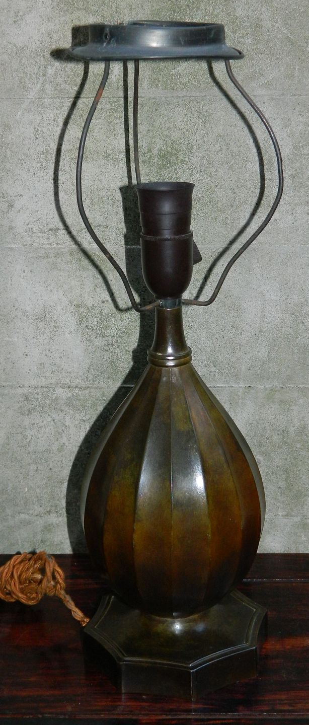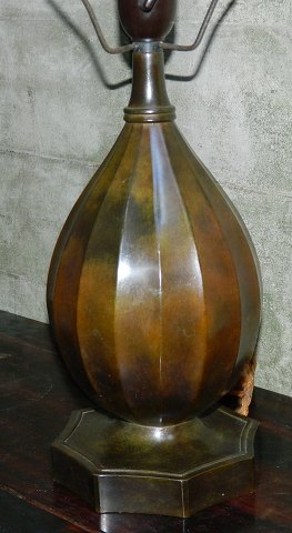 Just Andersen bordlampe af diskometal med smuk bronze- patinering: Kanneleret dråbeformet korpus på 8-kantet fodstykke. Stemplet Just A. samt modelnummer 1860 Denmark. Højde incl. montering 48 cm. Uden montering 28 cm høj.