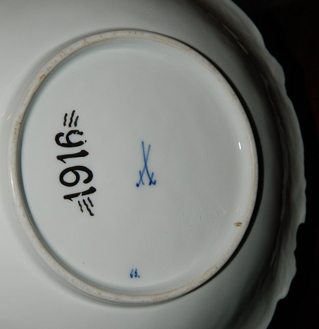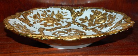 Stort fad i porcelæn fra Meissen, Tyskland, fra begyndelsen af 20. århundrede. Dekoreret med blomster i guld. Fremstår i perfekt stand. Ingen brugsslid på guldbelægningen. 5½ cm høj og 31 cm i diameter.