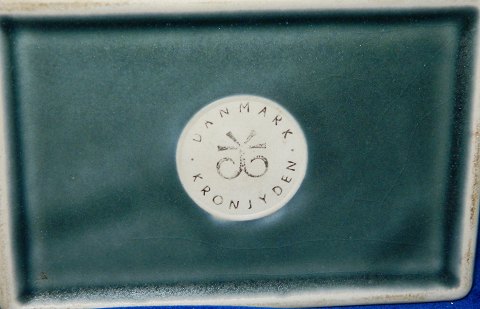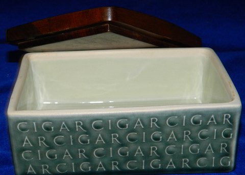Four-sided bowl in ceramics from Kronjyden. Covered with green glaze. The bowl is four sitting covered by the word "cigar". Lid in rosewood from Nissen. Dimensions: 7½ cm high and bowl measures 10 cm x 15½ cm. Factory mark on the bottom of the bowl.