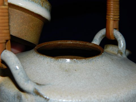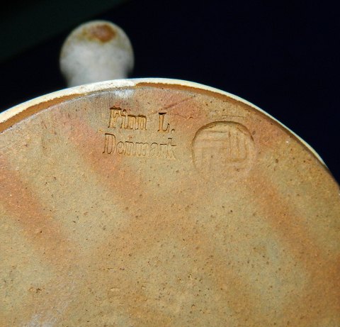 Tepotte i keramik af Finn Lynggaard fra eget værksted. Dækket af en lys grålig glasur. Hank i bambus i god stand. To små overfladeridser på kanten nederst på låget (se foto). Stemplet kunstnersignatur samt logo på undersiden. 15½ cm høj. 21½ cm høj incl. opretstående hank.