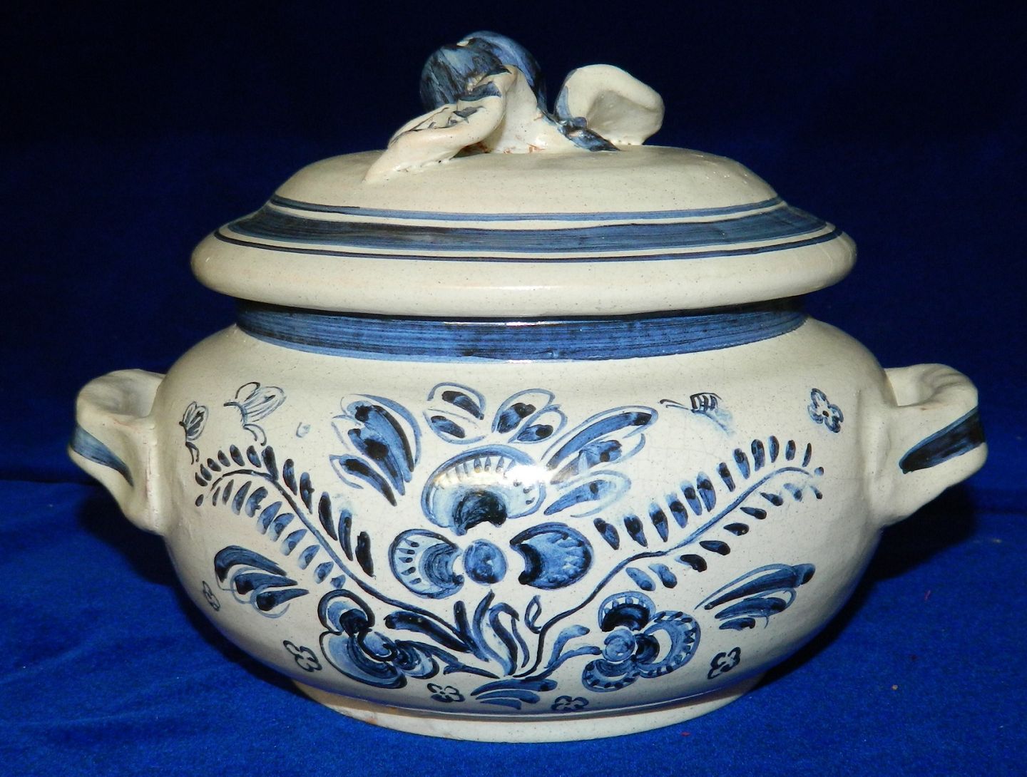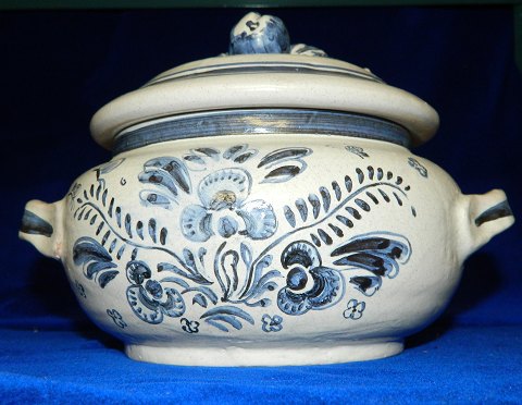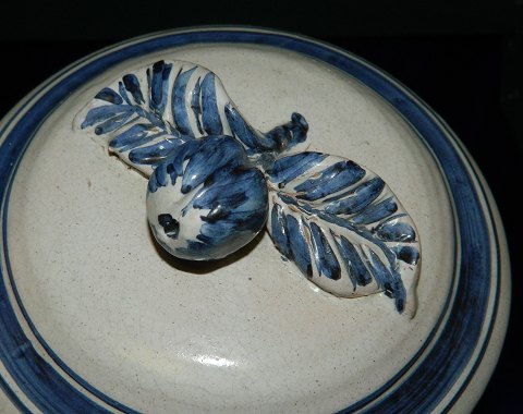 White tureen with blue decoration from Lars Syberg ceramics. Made in the 1930s. Practical handles and flower on top of the lid as a handle. In perfect condition. Factory marks on the bottom. Dimensions: 15 cm high and from handle to handle 21½ cm.