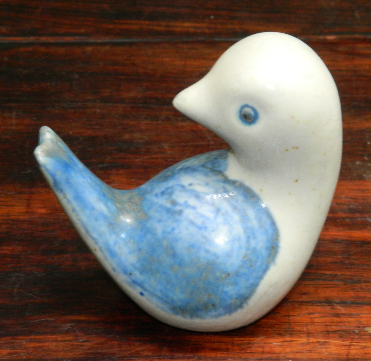 STENTØJSFIGUR AF KNUD BASSE: Figur i keramik af lille fugl i keramik. Vingerne dækket af en blålig glasur. Udført af Knud Basse (1916-1991), der havde sit værksted på Bornholm. Figuren er i perfekt stand. Signeret af kunstneren på bunden med KB. 8 cm høj.