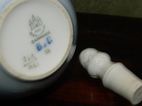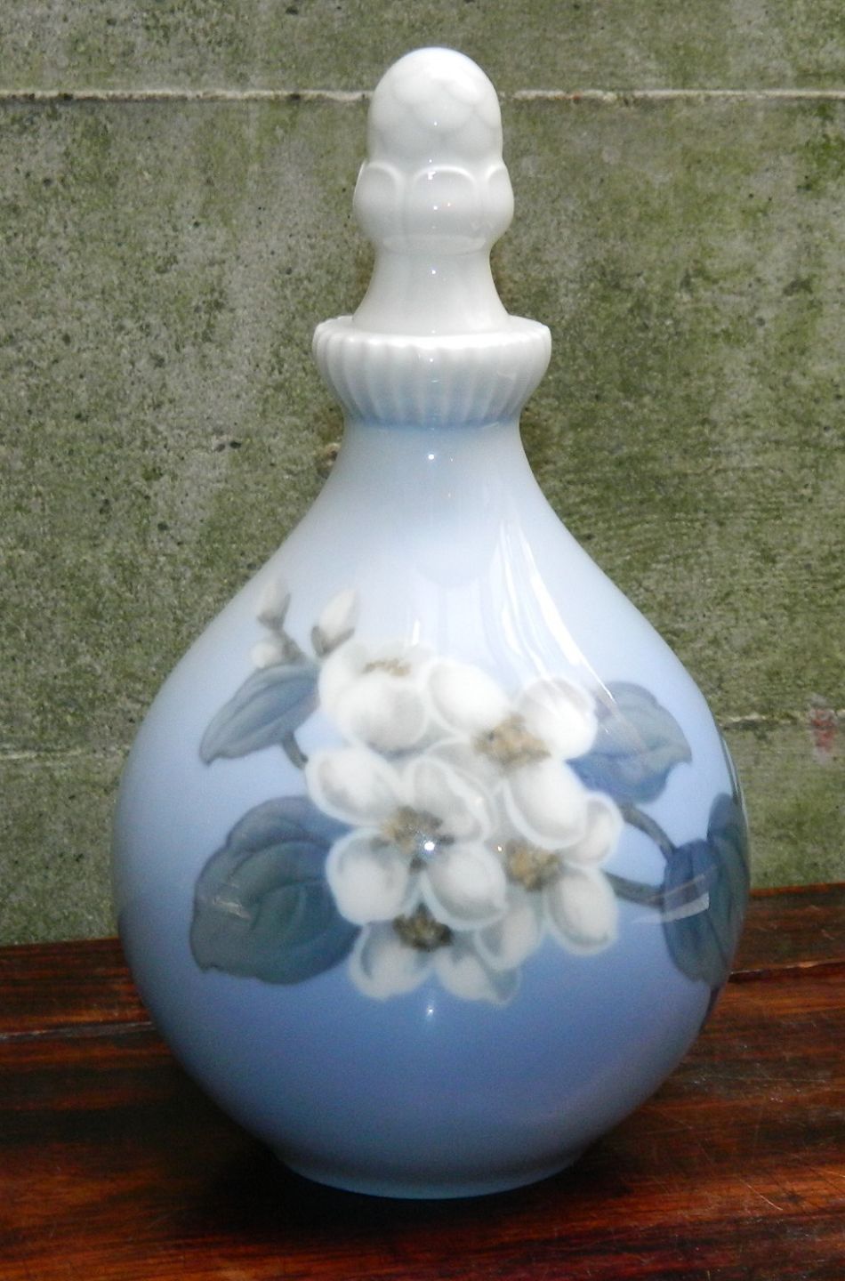 Flacon med prop i porcelæn fra Bing & Grøndahl. Dekoreret med æbleblomster. Ubetydeligt skår på undersiden af proppen. Ellers i supergod stand. 1. sortering. Fabriksmærket på bunden. 18½ cm høj incl. prop.