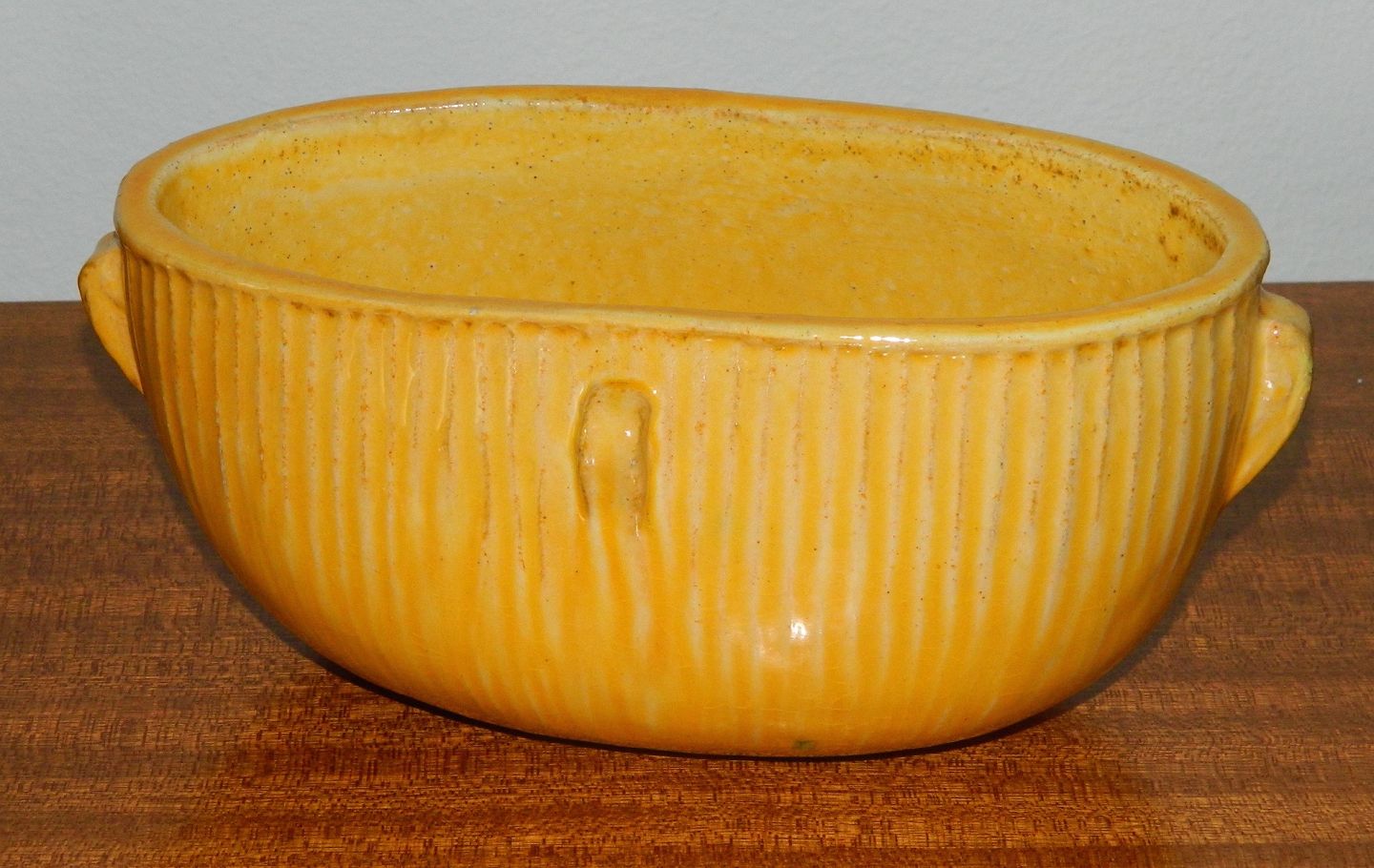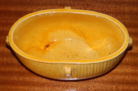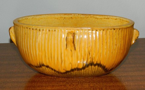 Bowl or jardiniere in ceramics designed by Svend Hammershöi. Covered with yellow glaze with black splash. Also decorated with four small ears. In perfect condition. Factory marks on the bottom with HAK and DENMARK. Dimensions: L .: 21.5 cm H .: 9.5 cm, and 12 cm deep.