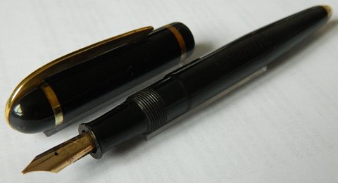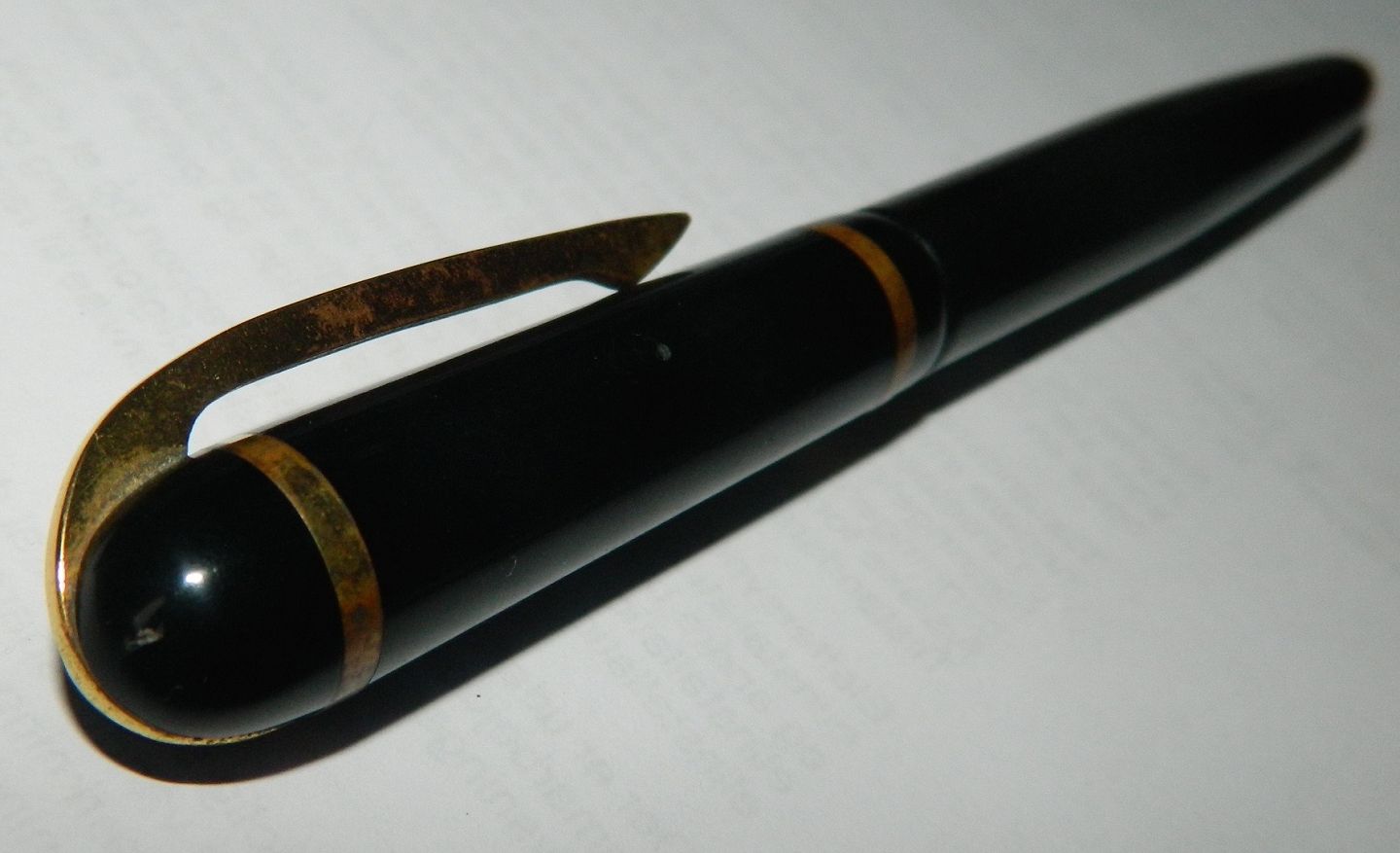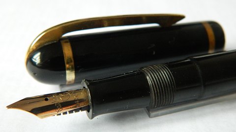 Black "Parliament" fountain pen in art deco style. Push button filler. In good condition with no damage or repairs. Need a new rubber sack before use. By surcharge of kr. 325.00 can fill the pen supplied with new rubber sack. All parts originally for this model inclusiv the nib in 14 carat gold. Measures: 13.5 to 14 cm long