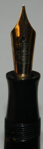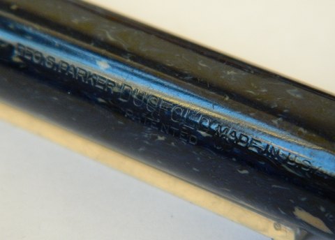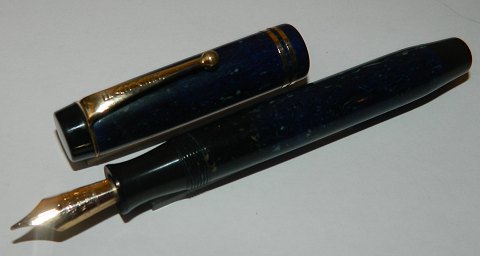 Small blue marbled Parker Duofold fountain pen from the 1930s. In good condition. Nice surface. In good condition. All parts original Parker. New rubber sack must be inserted before use. By surcharge of kr. 325.00 the pen can be supplied with new rubber sack. 11 cm long