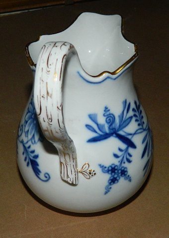 Fløde eller mælkekande i porcelæn med høj hank fra Meissen, Tyskland, ca. 1900. Dekoreret med løgmønster samt guldstaffering. Fremstår i god stand uden skader eller reparationer. Fabriksmærket på bunden. 14 cm høj
