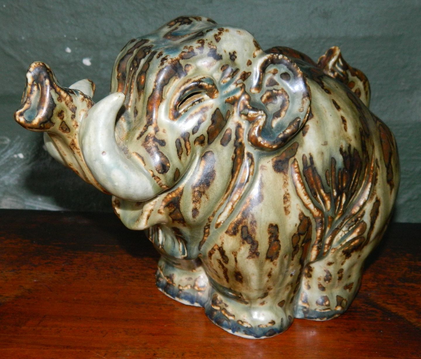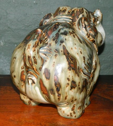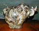 Figur i stentøj fra Royal Copenhagen af "Glad Elefant" dækket af Sung glasur. Formgivet af Knud Kyhn. Figuren er 1. sortering med modelnummer 20138. Ingen skader eller reparationer. Fabriksmærket på bunden samt indridset kunstnersignatur KK. Mål: 17½ cm høj og 25 cm lang.