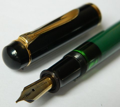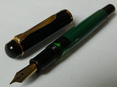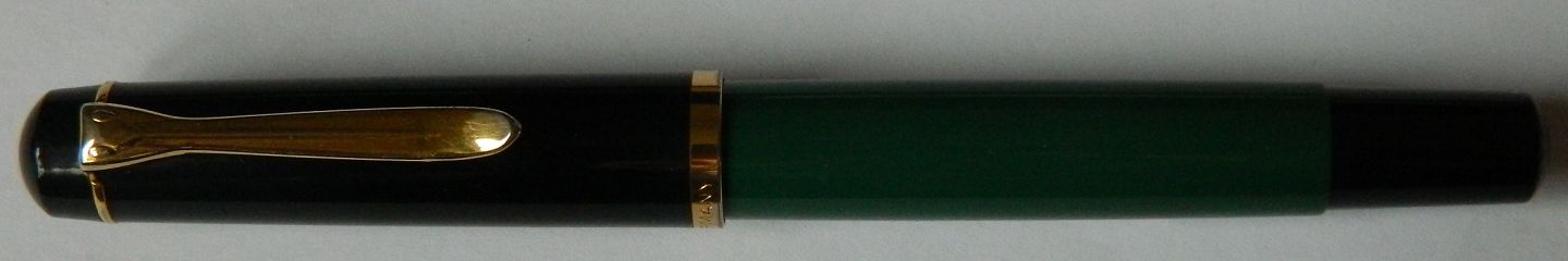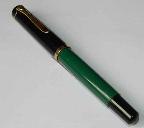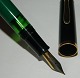 Grøn Pelikan fyldepen med grøn hætte. Fungerer fint med piston påfylder. Ingen skader eller reparationer. Klar til at blive brugt. 13 cm lang.