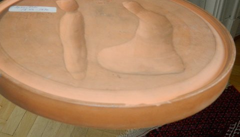 Bemalet platte i terracotta fra Peter Ipsen, Kjøbenhavn. Motiv af Bertel Thorvaldsen (1770-1844) med "Herkules modtager udødelighedens drik af Hebe". Har et par små skår. Fremstillet omkring 1870. Fabriksmærket på bagsiden med P. Ipsen samt modelnummer. Mål: 22½ cm i diameter.