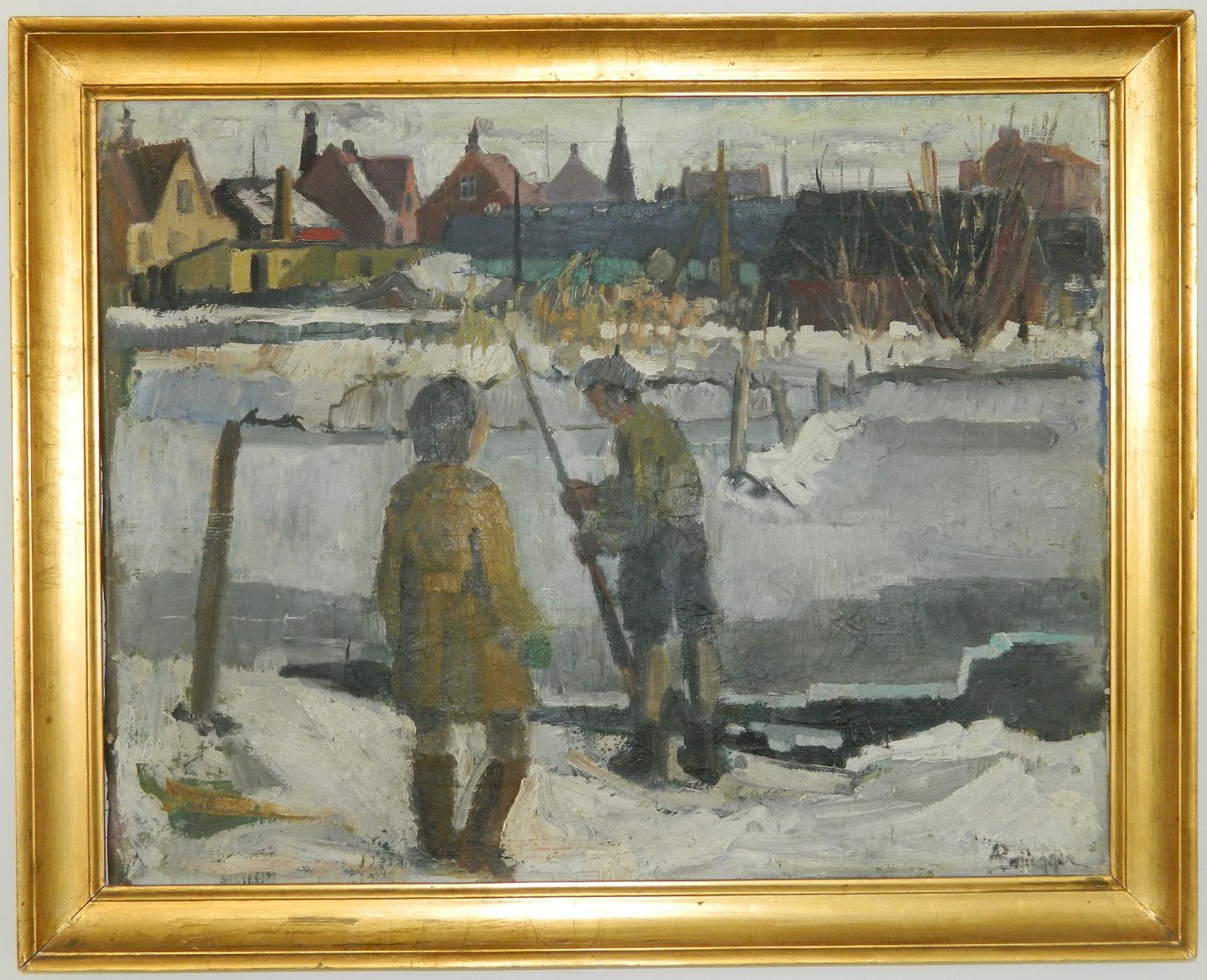 Oliemaleri på lærred med vintermotiv - to personer der skovler sne. Signeret men ubekendt kunstner. Lærred og rame i god stand. Mål 80 cm x 99 cm incl. den kraftige ramme i træ.