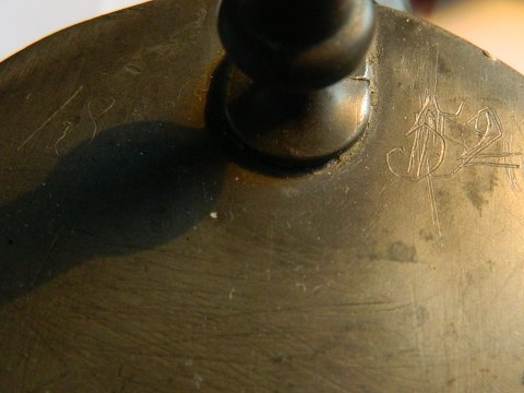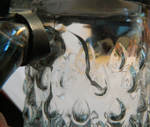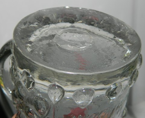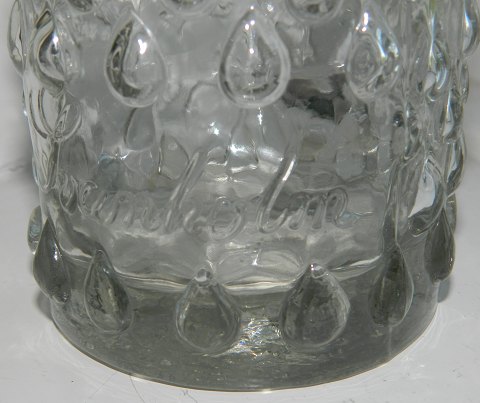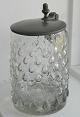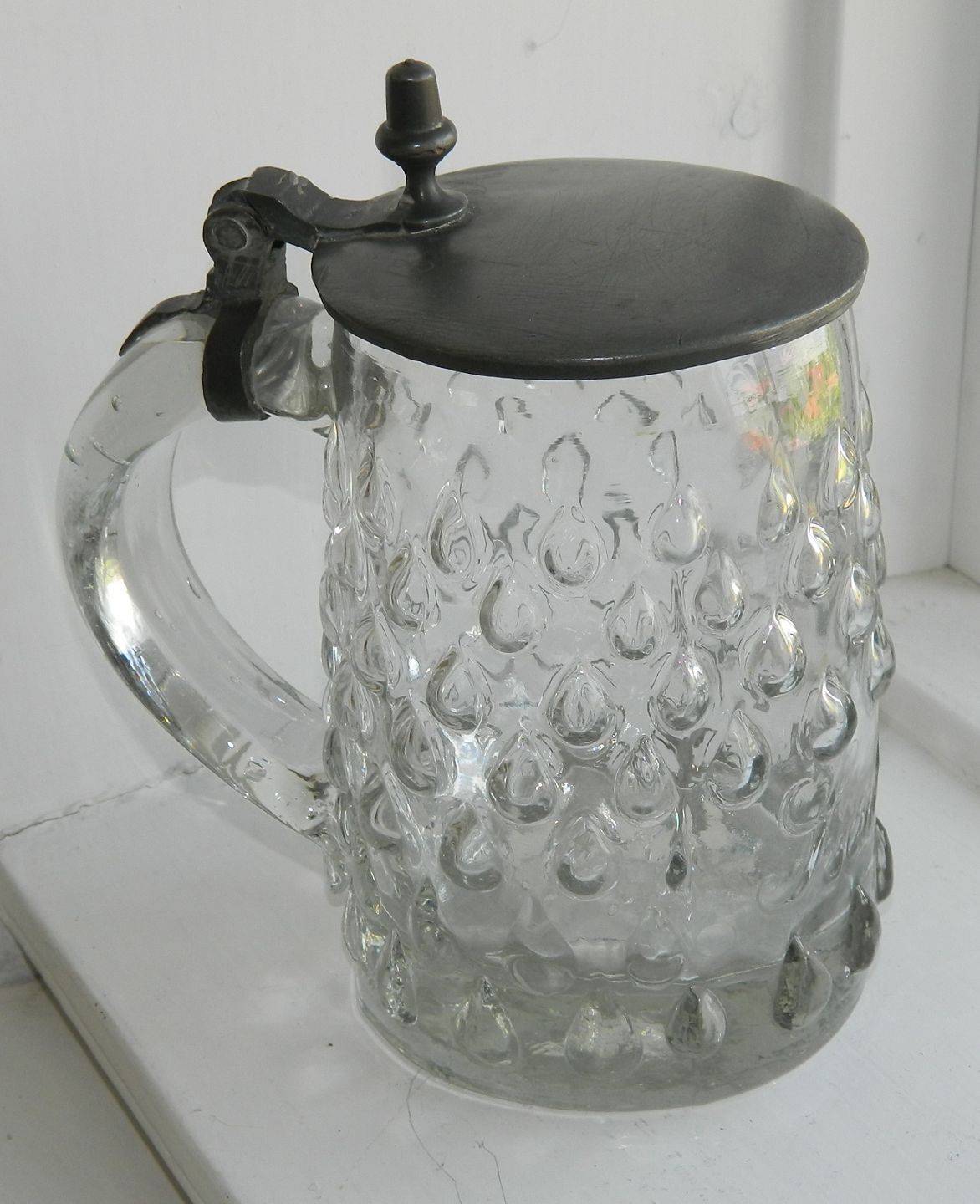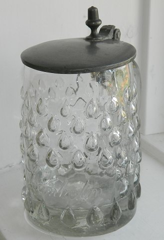 Svanholm mug in glass with lid in pewter. Lid engraved 1852. In good condition. However crack at the upper part of the handle. Teardrop-shaped decoration in relief and "Svanholm" text on the front. Made in the mid-19th century. Dimensions: 13 cm and 16½ cm high incl. the lid.