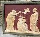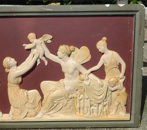 Stort vægrelief i gips fra H. C. Brix værksted ca. 1900 forestillende Bertel Thorvaldsen´s relief med Kærlighedens Aldre. Psyke uddeler amoriner, der symboliserer kærligheden. Her forskellige personers reaktion på gaven - F.eks. den gamle mand der ikke kan nå sin og den unge kvinde, som tilbeder sin amorin (kærlighed). Originalt bemalet bund i bordeaux. Figurerne malet i lyse farver. Relieffet har småhak her og der samt mindre skår. Fabriksstemplet på bagsiden. Mål: 30 cm højt og 76 cm langt. Godt 2 cm dybt.
