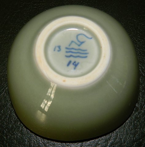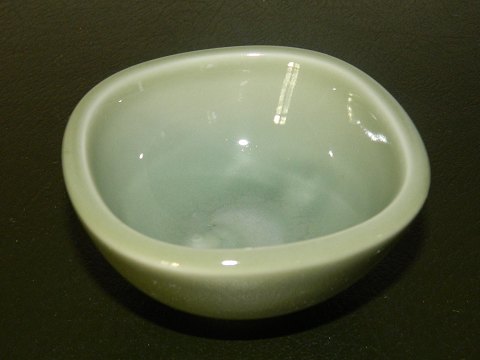 Lille skål i stentøj dækket af celadon glasur af Nils Thorsson for Royal Copenhagen. Dekoreret med fisk i bunden af skålen. Fabriksmærke samt kunstnersignatur på bunden. 1. sortering. Ingen skader eller reparationer. Mål: 4½ cm høj og 9 cm x 9 cm i åbningen.