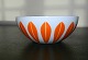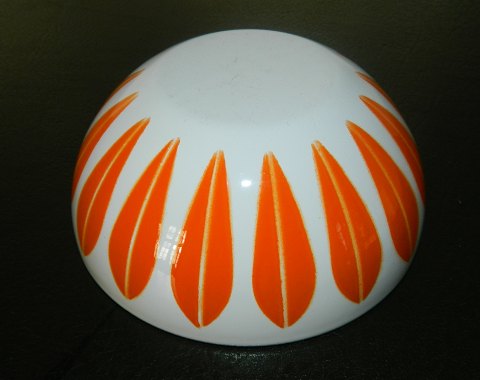 Skål i metal med emalje med chili-farvet Lotusblade på hvid bund. Fremstillet hos Cathrineholm i Norge. MINT - fremstår i perfekt stand. Mål: 6 cm høj og 14 cm i diameter.