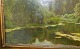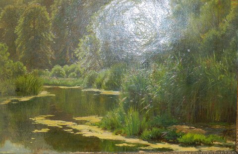 Olie på lærred: Skovparti med sø af Godfred Christensen 19. århundrede