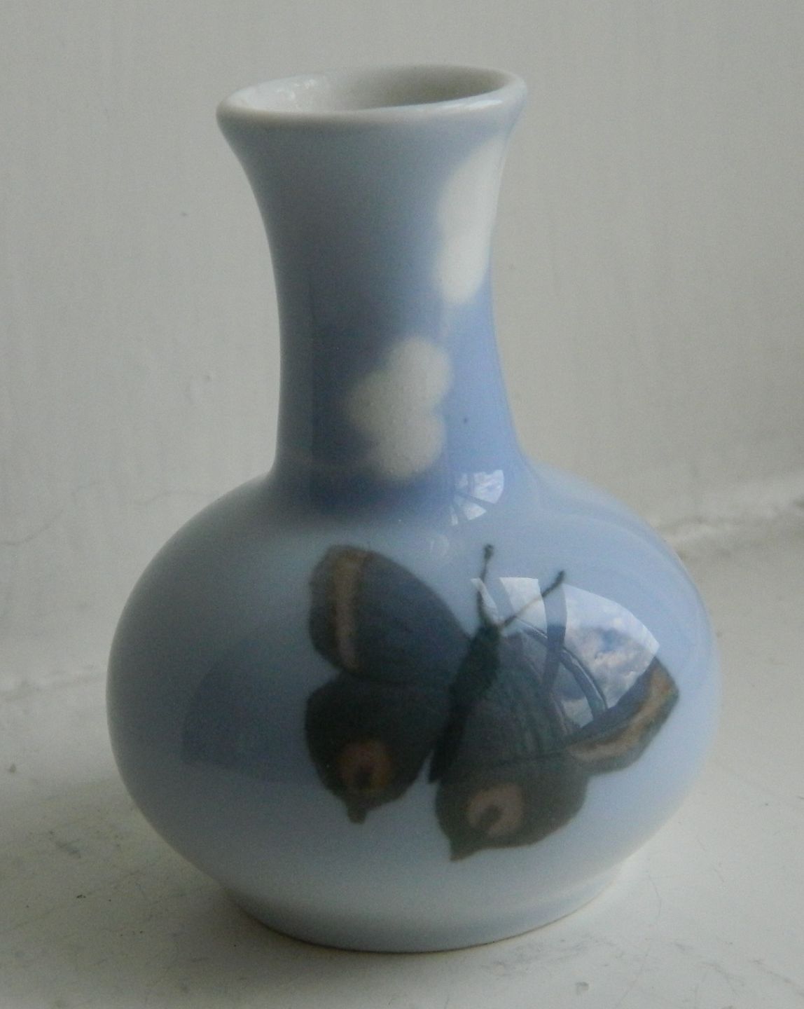 Miniature vase in porcelain from Royal Copenhagen. Made between 1900-23. In perfect condition. Factory first production. Decorated with butterfly. Factory marks on the bottom. 6 cm high.