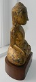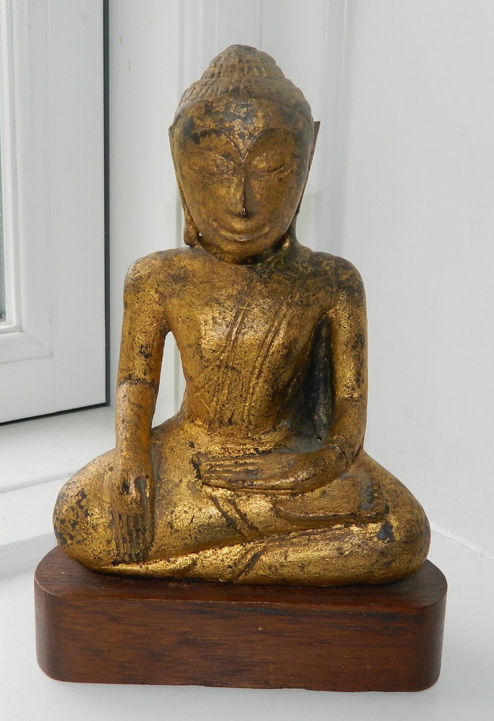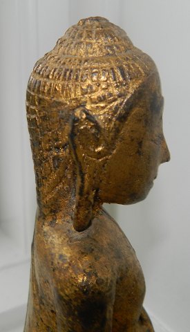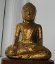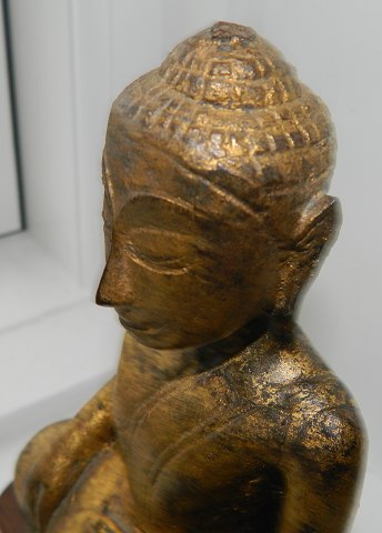 Gilded figure of Buddha sitting on a new base in teak. The figure is made in Thailand in the 18th. century. Carefully restored with newer gilding. 17½ cm high