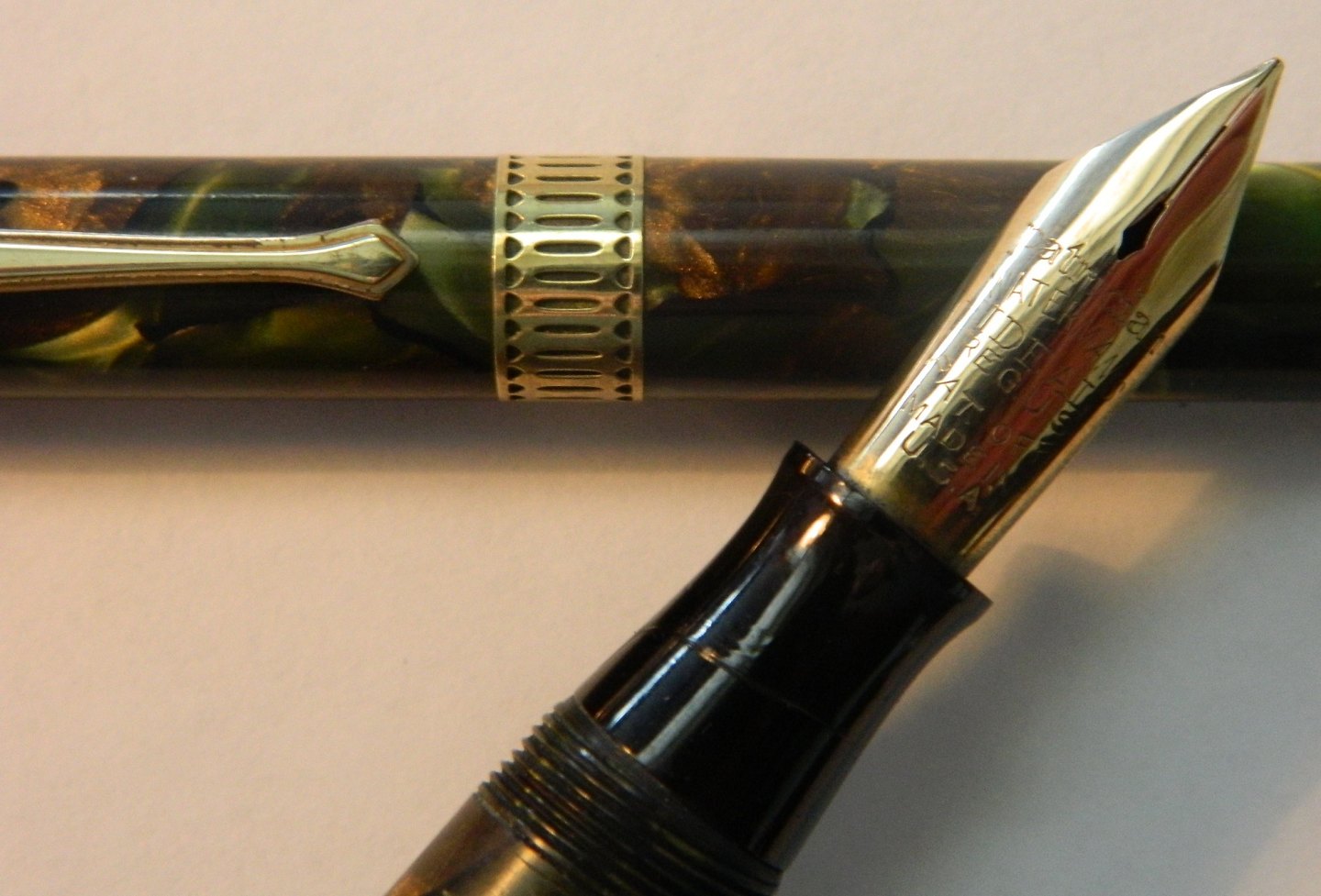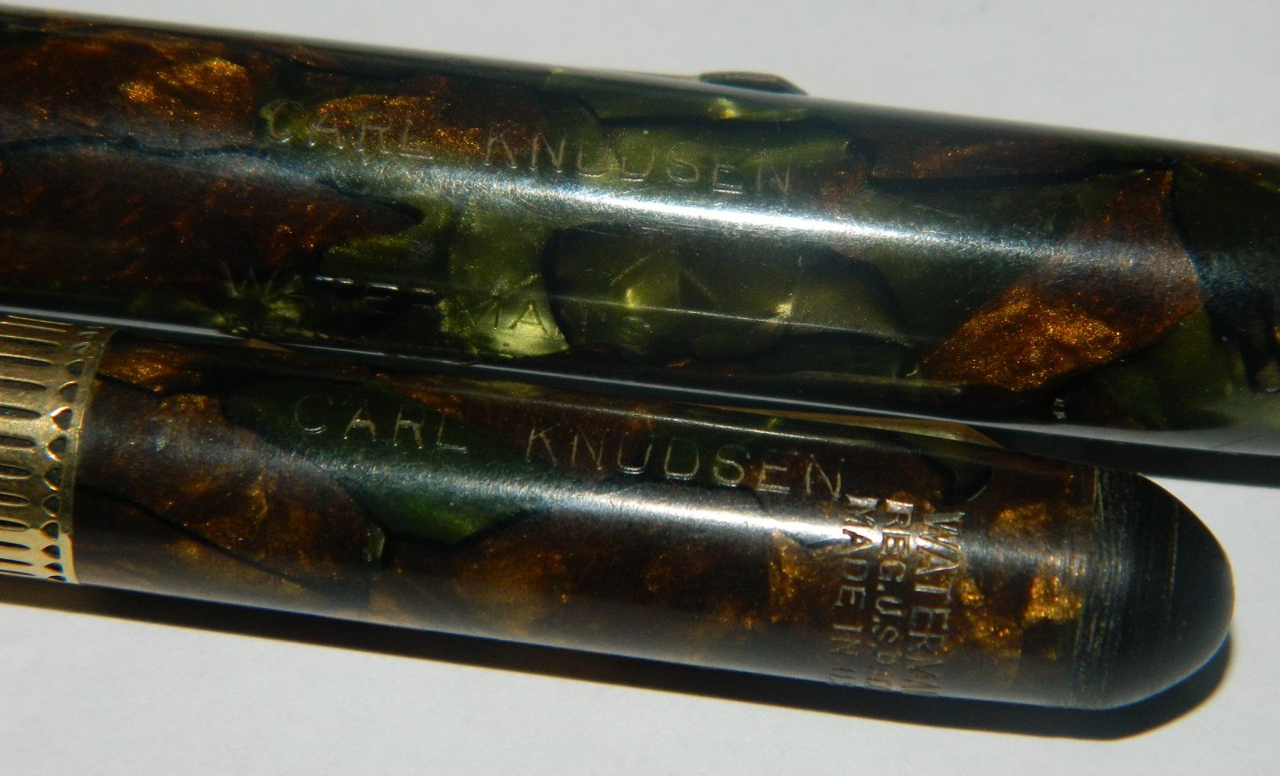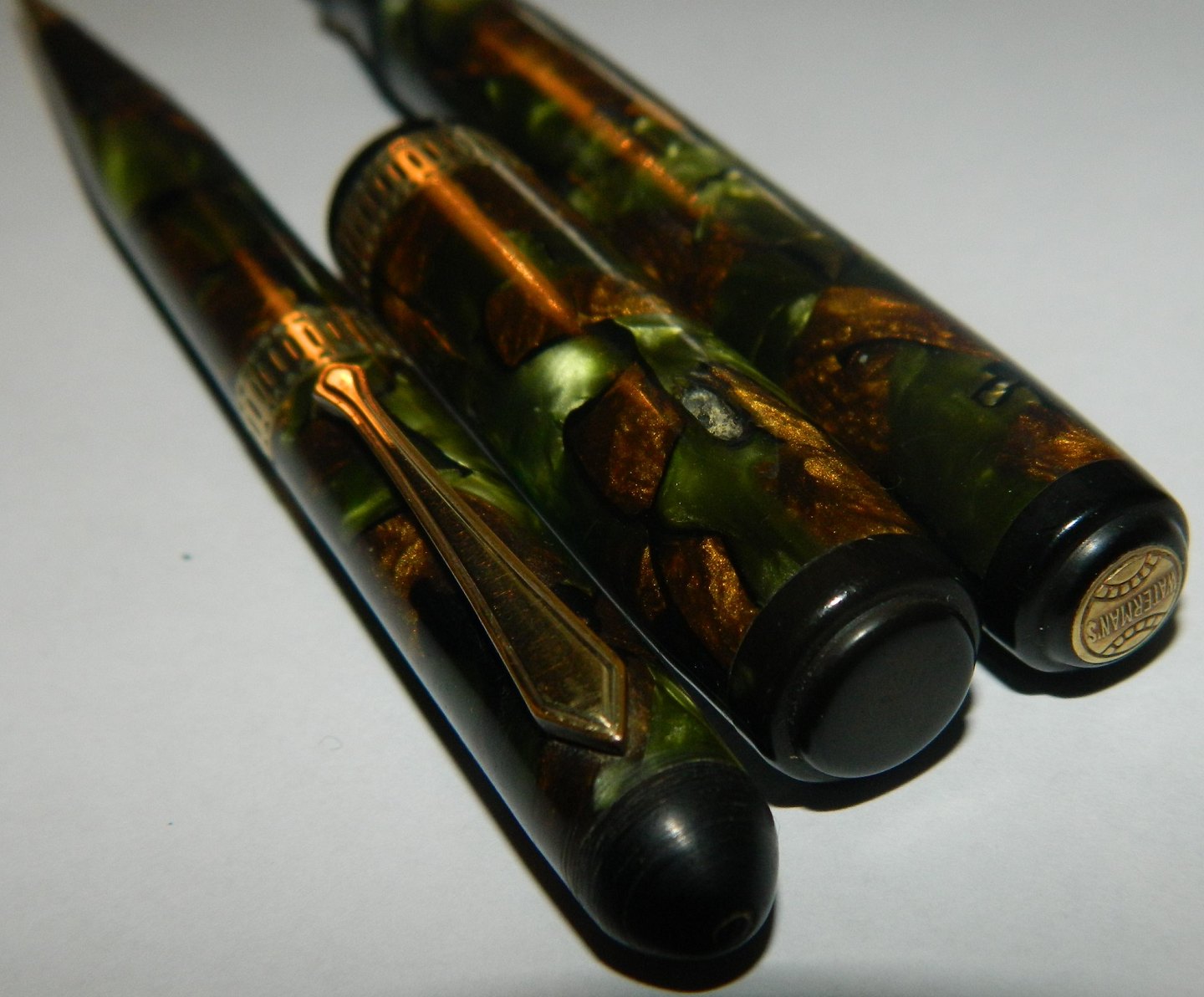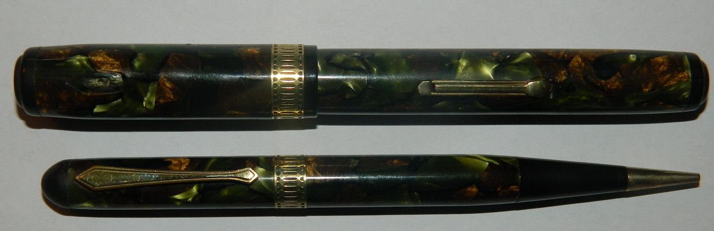 Green marbled Waterman's Ideal Patrician fountain pen set. Made in U.S.A in the 1930s. The fountain pen with leverfiller is close to 14 cm long the pencil 13½ cm. Both with engraved name. Fountain pen missing it´s clip. Otherwise no missing parts. Both pens in very good condition. Do not Work. Need a new rubbersack before it works again. New rubbersack costs kr. 325, - The set willl only be sold together.
