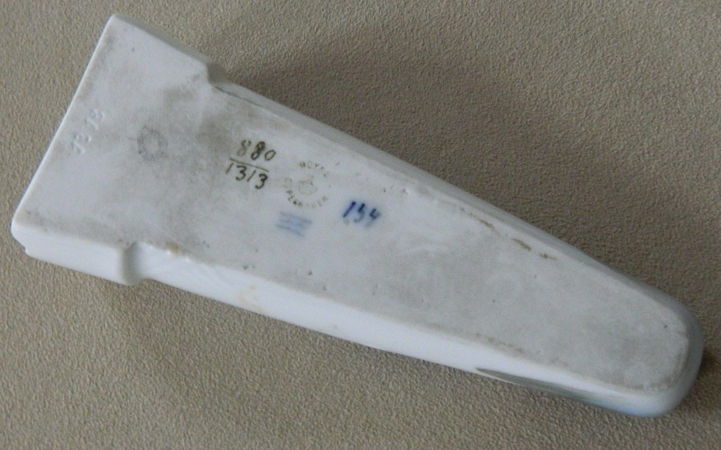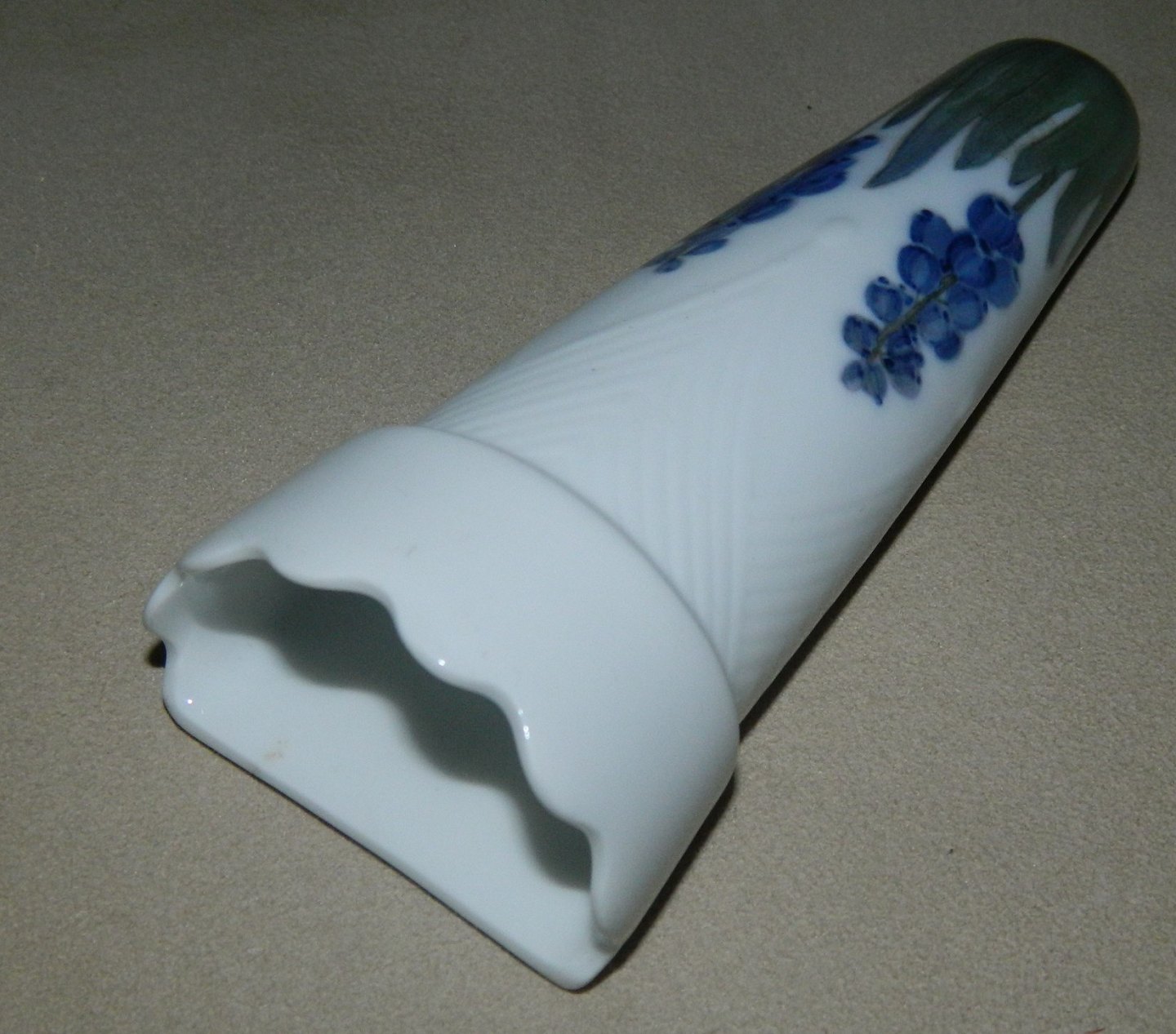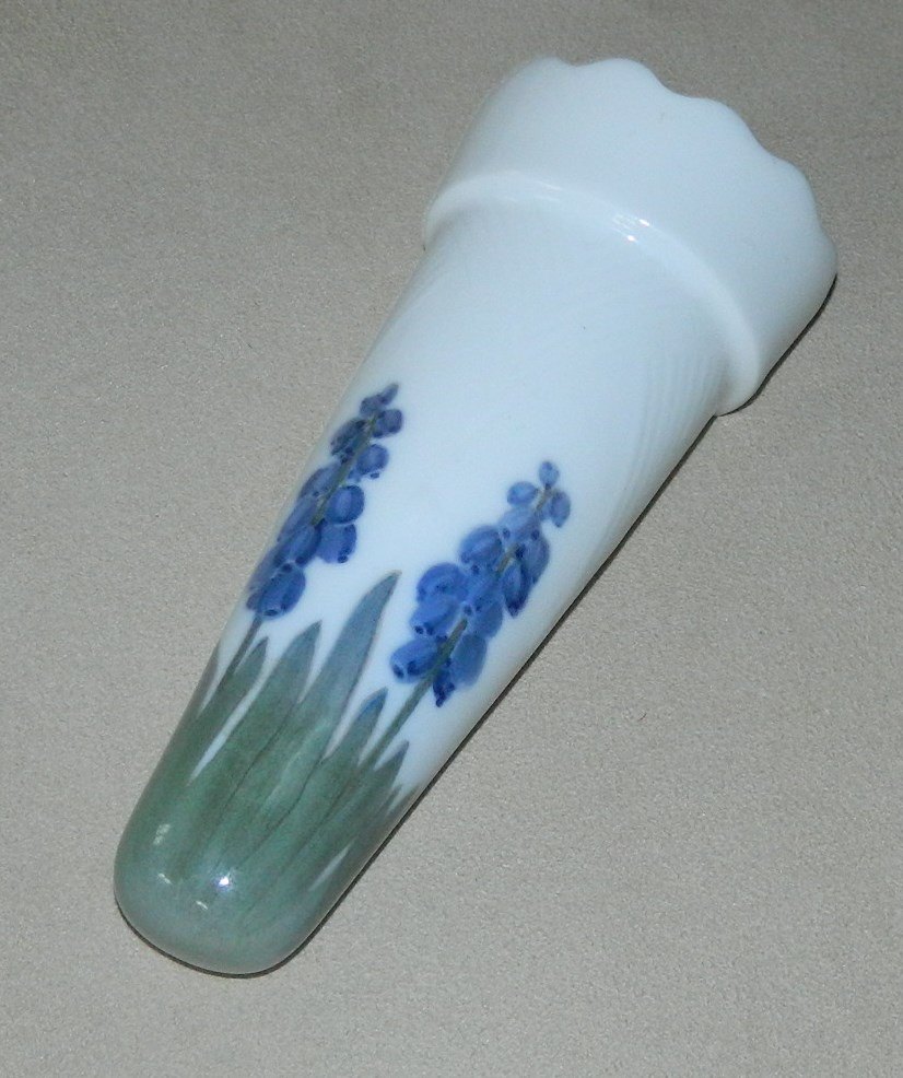 Vase to sting in the ground or as a wall vase from Royal Copenhagen in porcelain. The factory mark indicates that it was manufactured between 1900-1923. Simple floral decoration. Delicate surface patern decoration in relief. In perfect condition. Factory first production. Factory marks on the backside. 13 cm long.