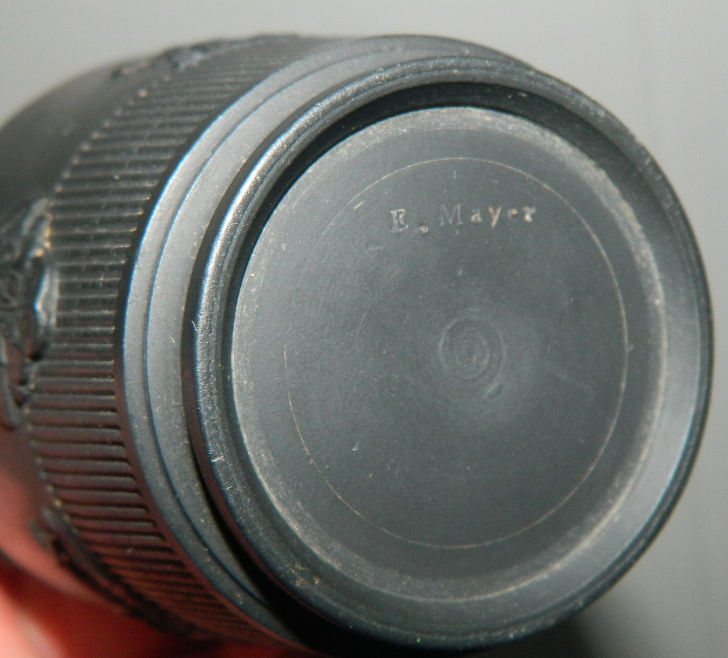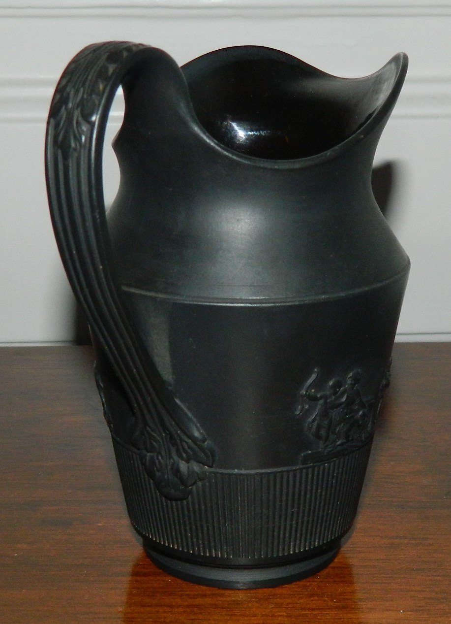 Creamer in black basalt pottery with classical motifs. Made by Elijah Mayer, England c. 1810. In perfect condition. Stamped E. Mayer on the bottom. H. 12½ cm