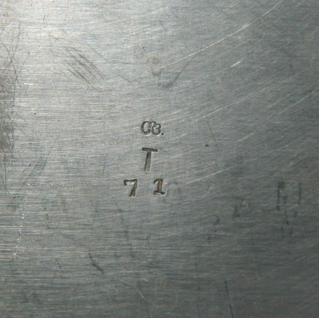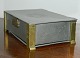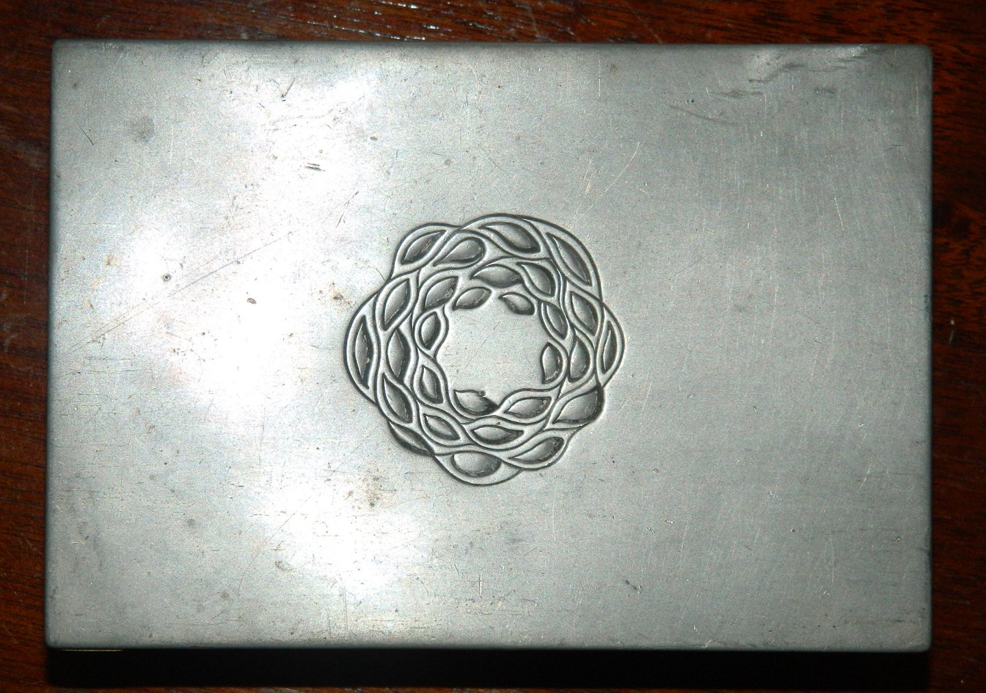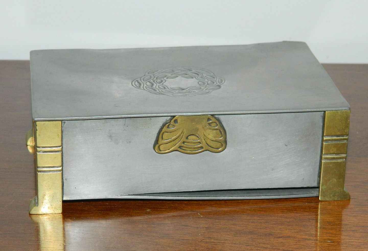 Tinskrin dekoreret i skønvirkestil. Bl.a. med ben i messing samt sommerfugl og ornamentik på låget. Fra Mogens Ballin´s værksted. Produceret i begyndelsen af 20. århundrede. Model nummer T71 samt kunstnermonogram MB på bunden Mål: H. 4½ L. 14 cm B. 9½ cm.