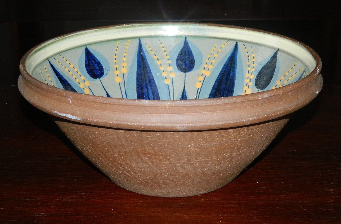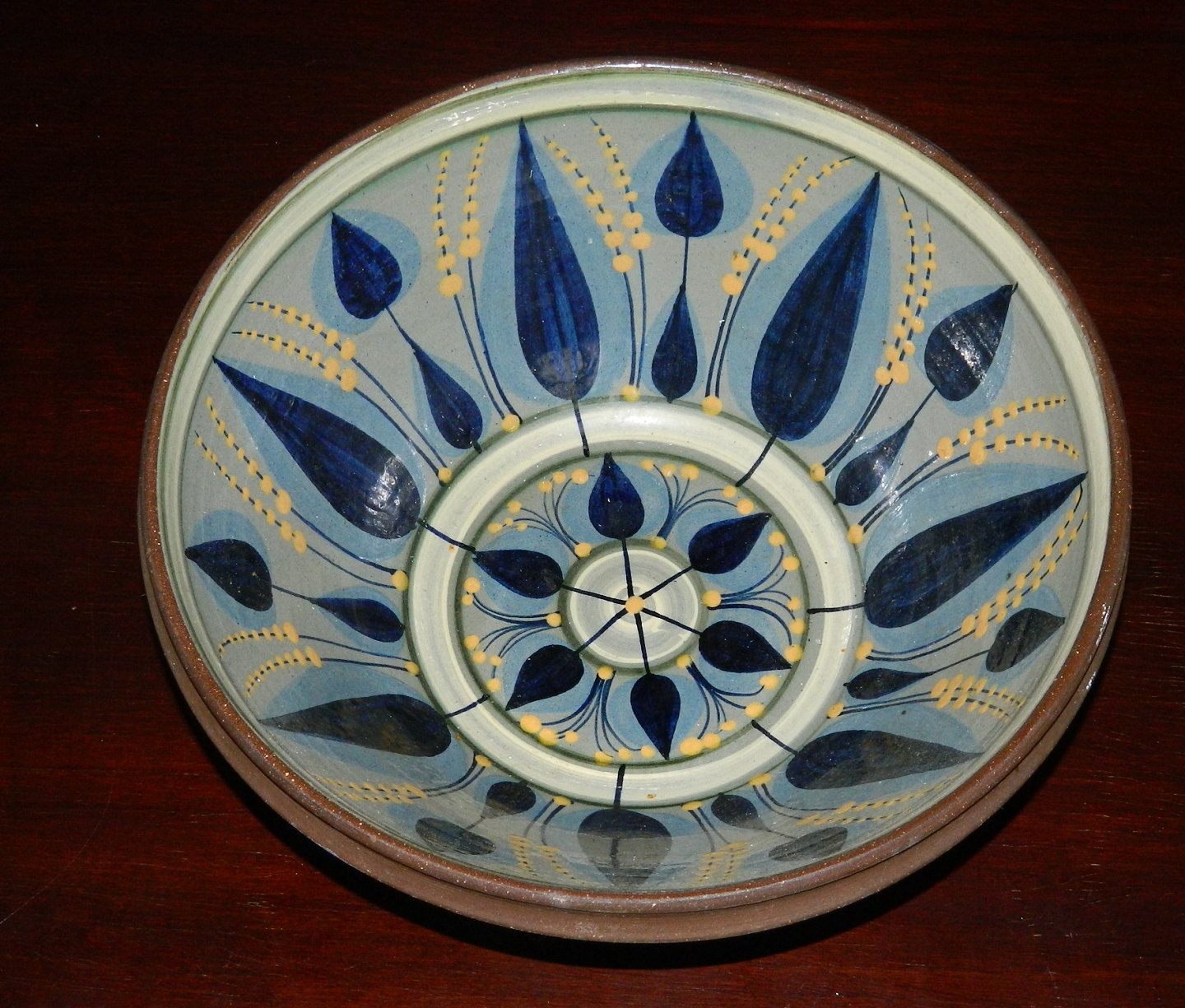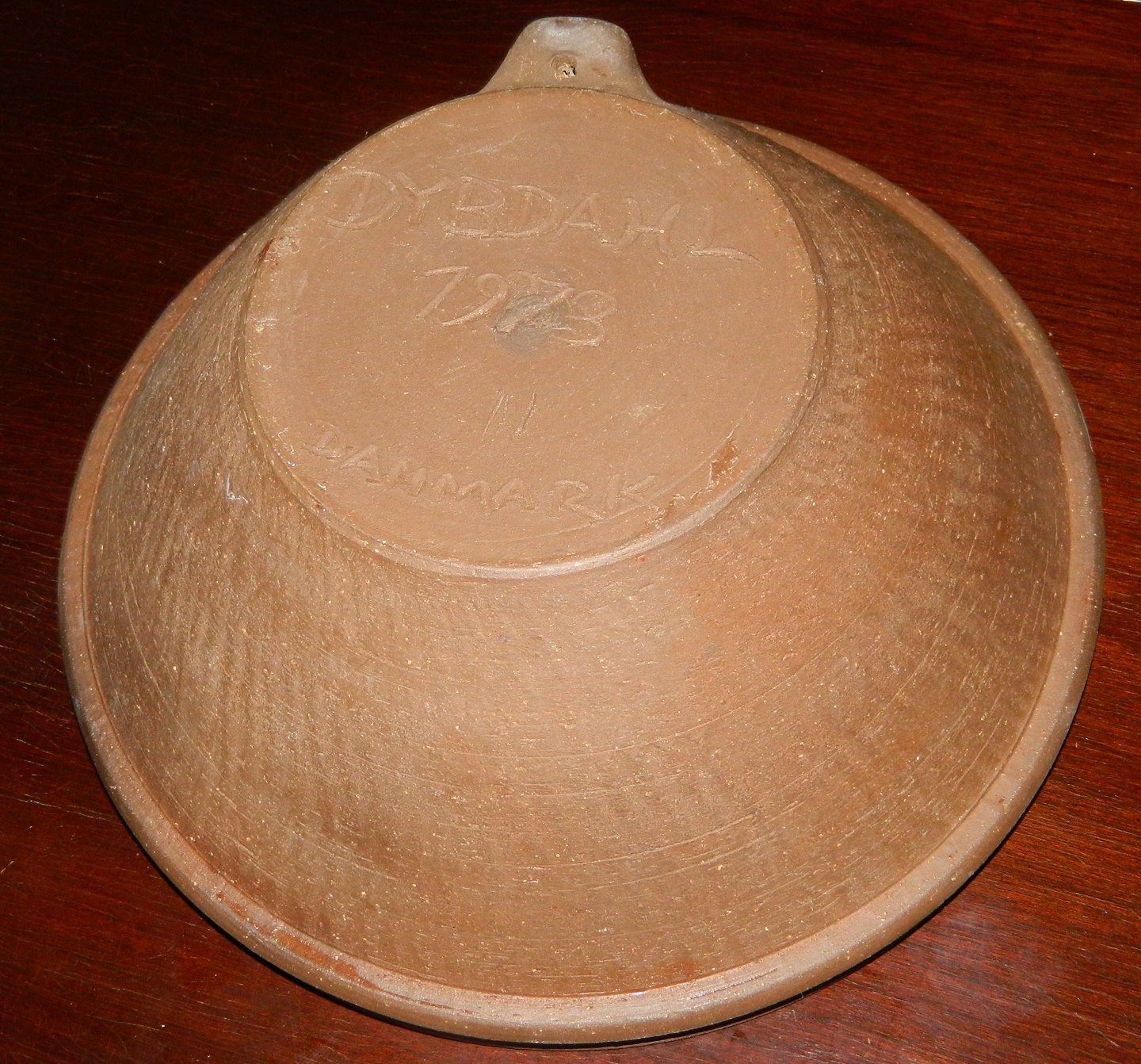 Skål i keramik fra Dybdahl keramik Danmark. Kun dekoreret og glaseret indvendigt. Produceret i 1973. Anordning til ophængning på væggen på bagsiden. Fremstår i perfekt stand. Fabriksmærket på bunden. Mål: H. 14 cm Ø. 33 cm.