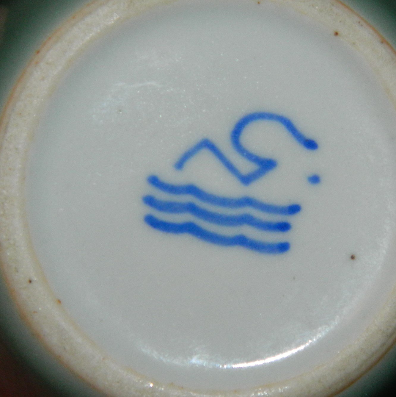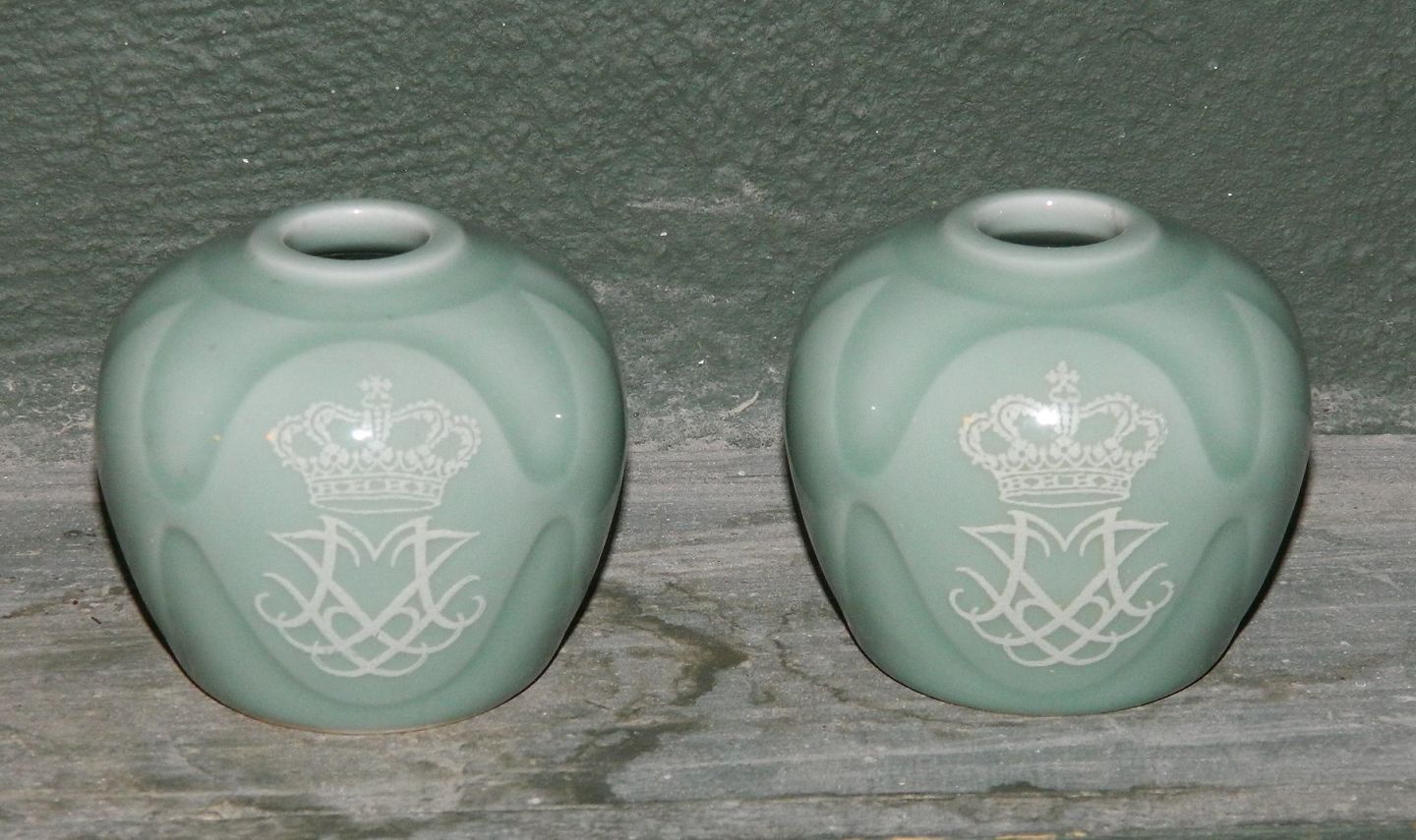 Par vase i keramik fra Royal Copenhagen designet af Nils Thorsson. Dækket af celadon glasur. Dronning Margrethe´s Monogram pryder vaserne. Fremstår i perfekt stand. Fabrikslogo samt kunstnersignatur på bunden. 6½ cm høje.