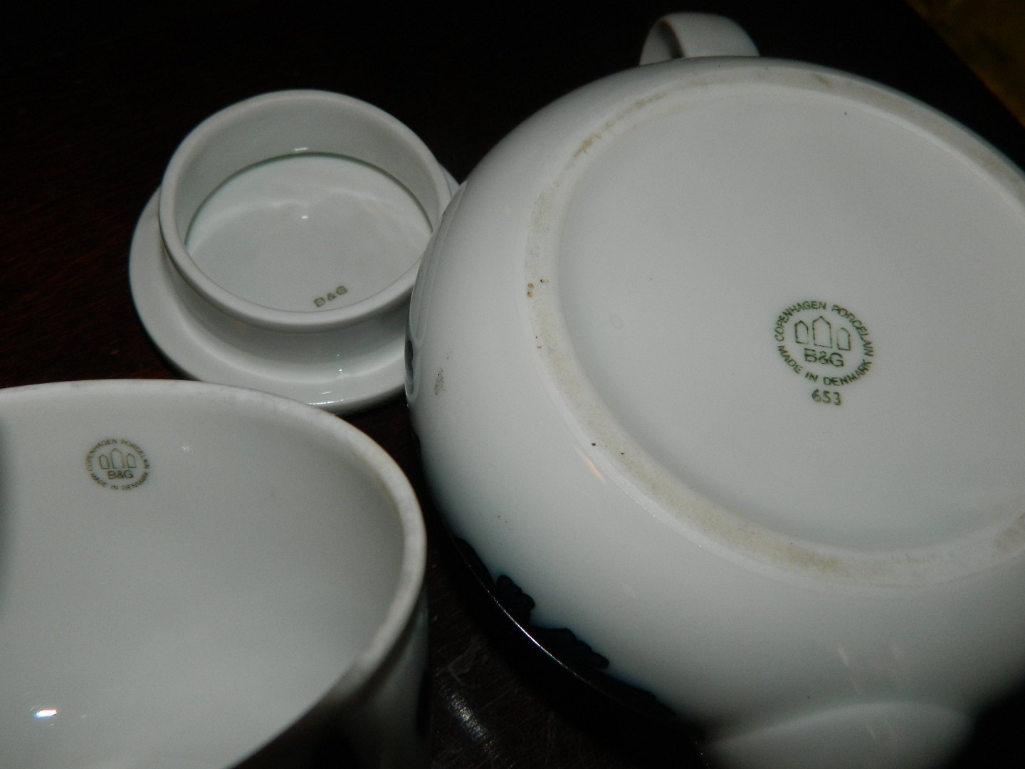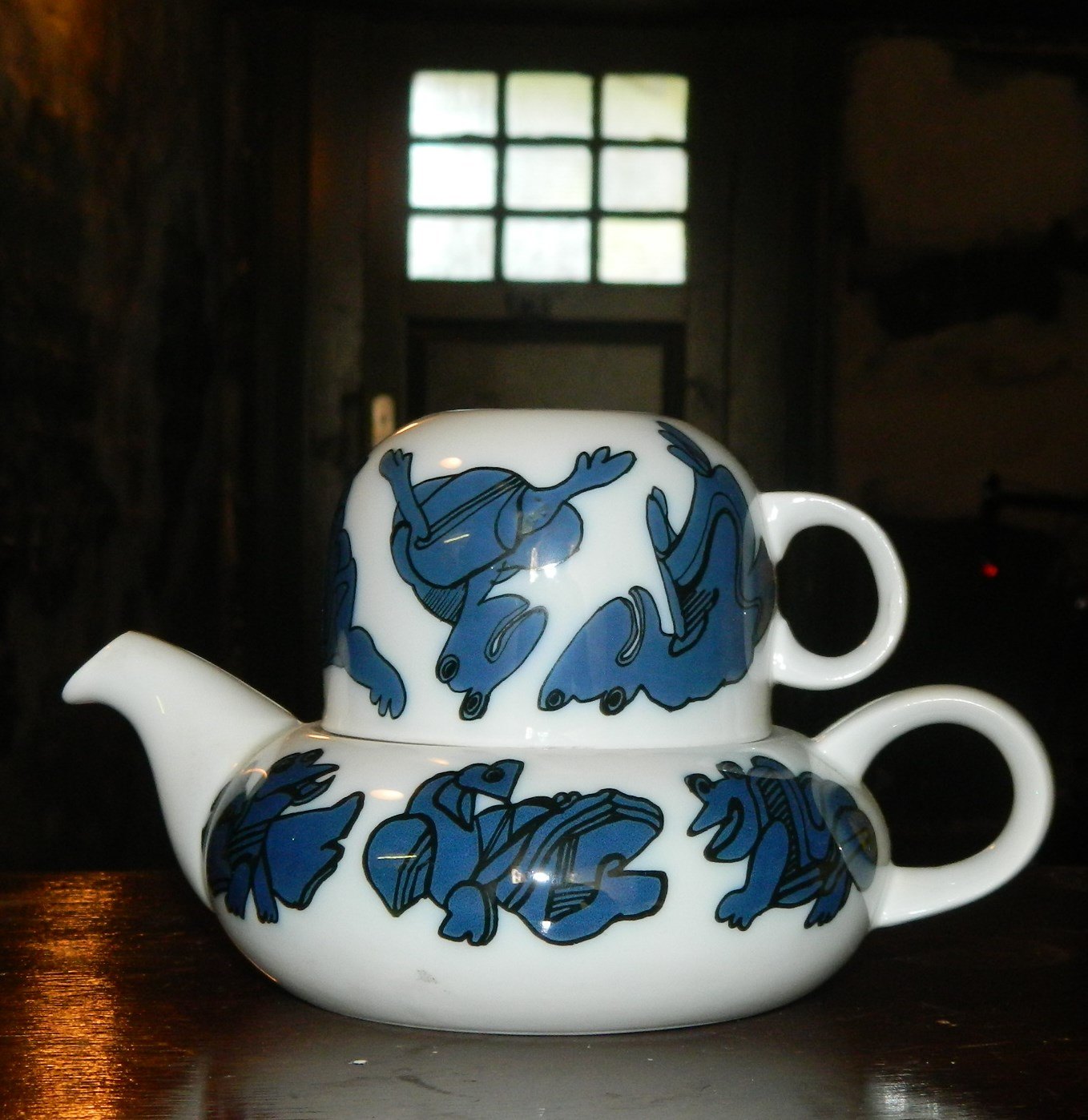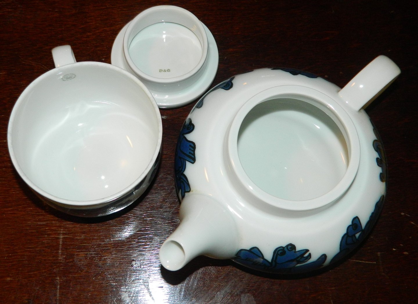 Hvid tepotte i porcelæn fra Bing & Grøndahl. Dekoreret med fabelfigurer i blå farver fra Sten Lykke Madsens fantasiverden. I god stand. 1. sortering. Alle dele fabriksmærkede. Mål: H. 11½ cm og 21 cm lang. Koppens åbningsdiameter er 9 cm.