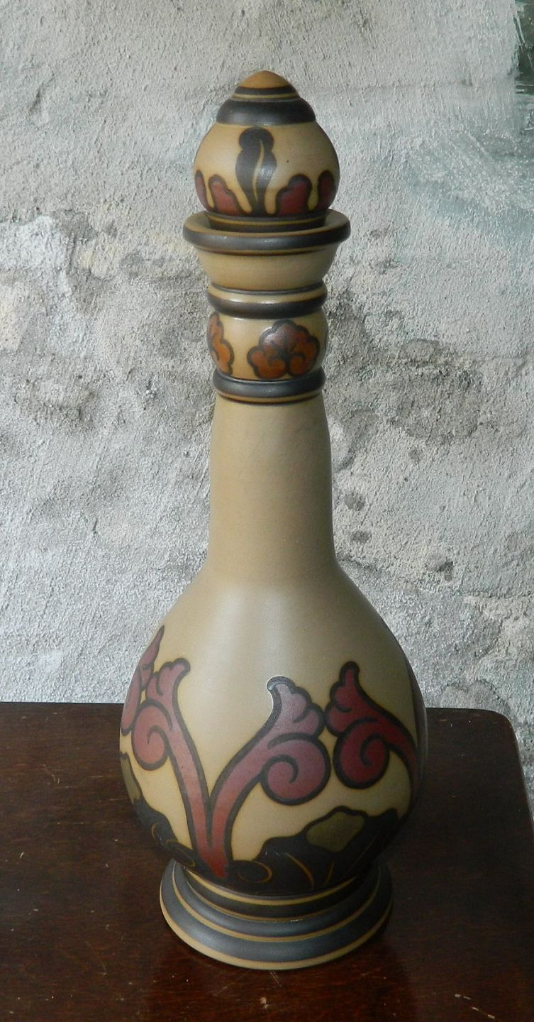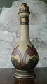 Sjælden karaffel med tilhørende propi keramik fra Lauritz Hjorth, Rønne, Bornholm fra begyndelsen af 20. århundrede. Bemalet dekoration i skønvirkestil. Fremstår i perfekt stand. Ingen skader eller reparationer. Fabriksmærket på bunden. Mål: 33 cm.