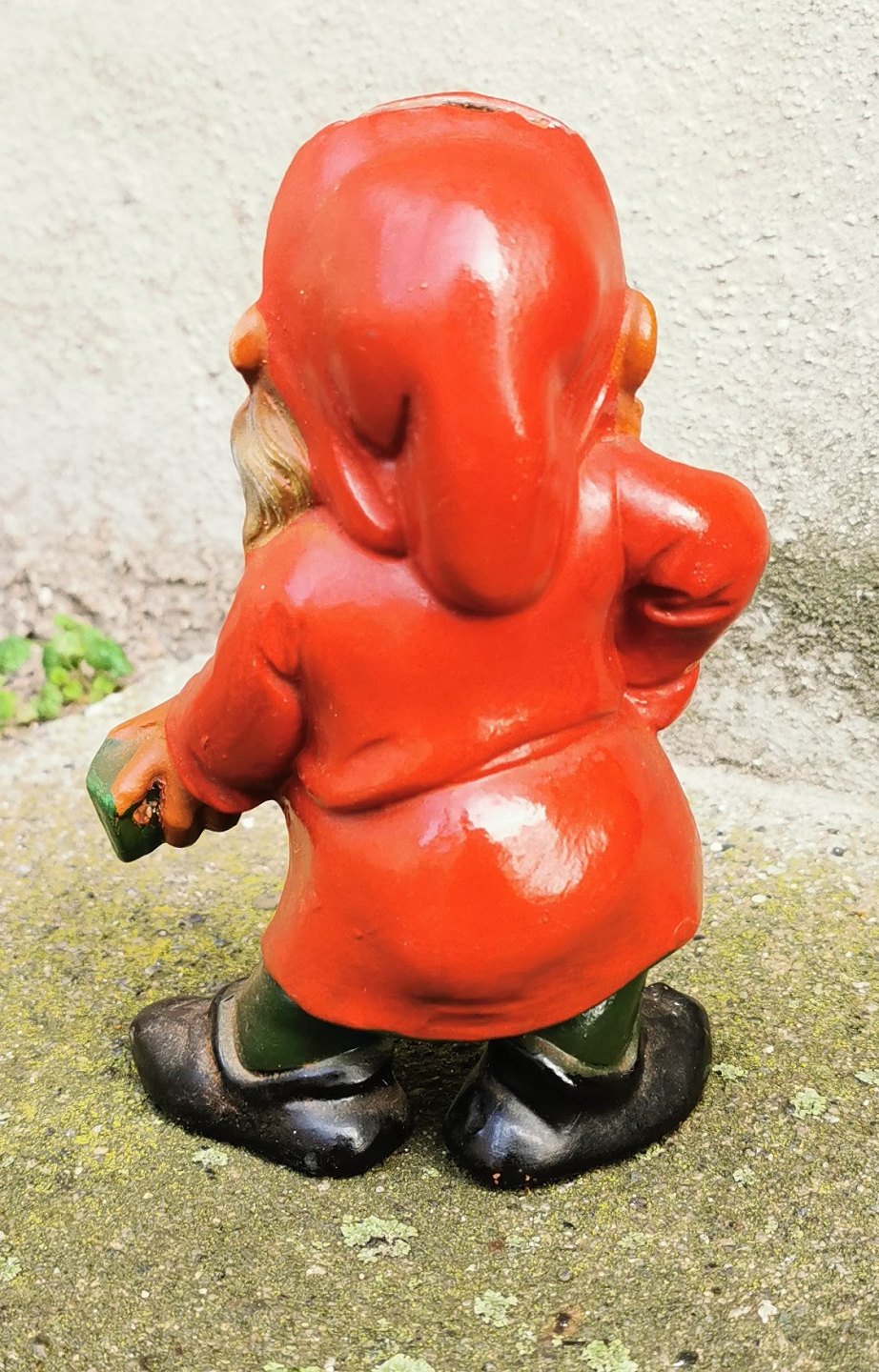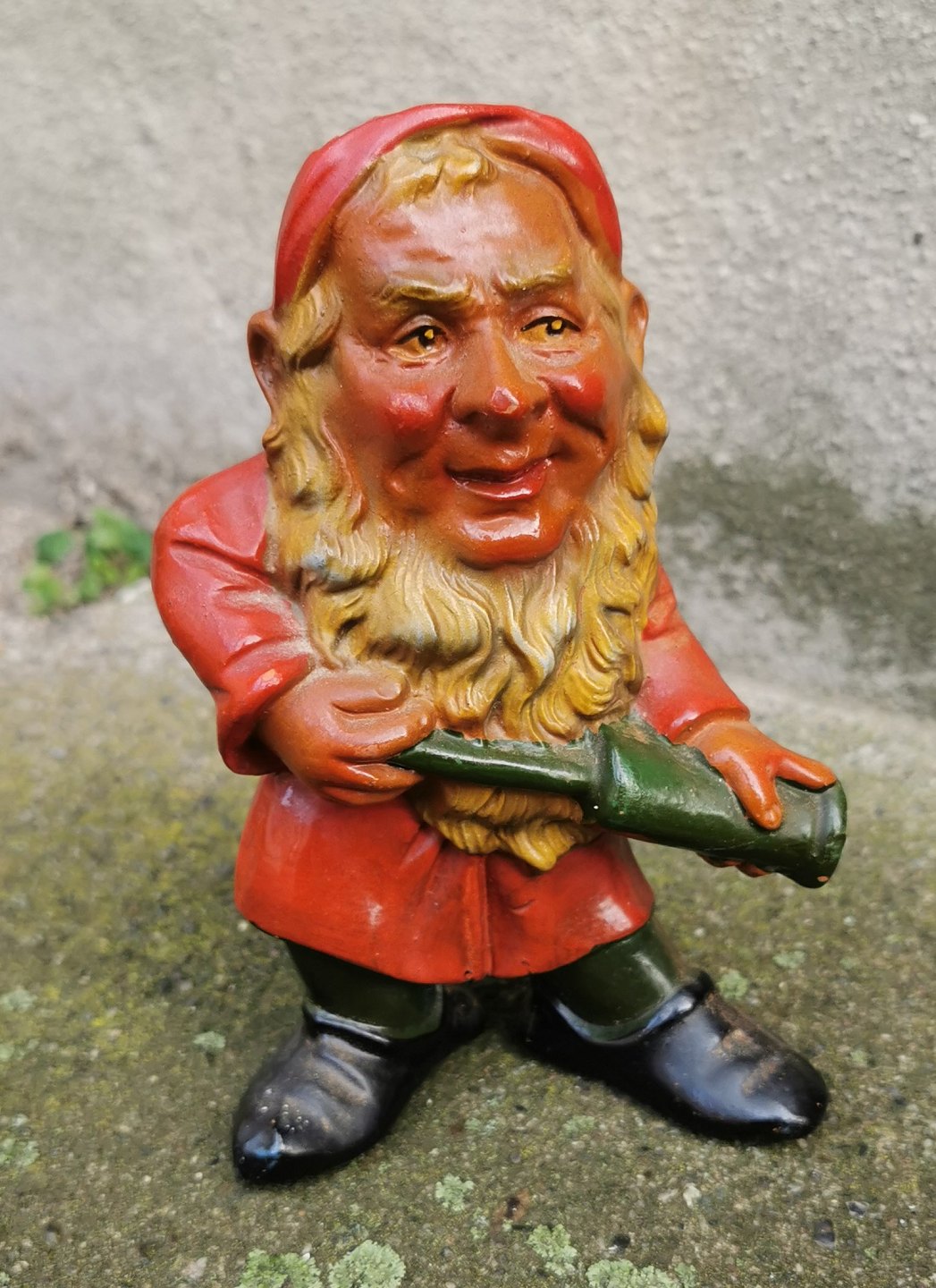 Bemalet nisse i keramik med bollesprøjte med funktion som sparebøsse. Fremstillet omkring 1900. Lidt småskår ved "møntrevnen". Ellers intet at bemærke. H. 16 cm.