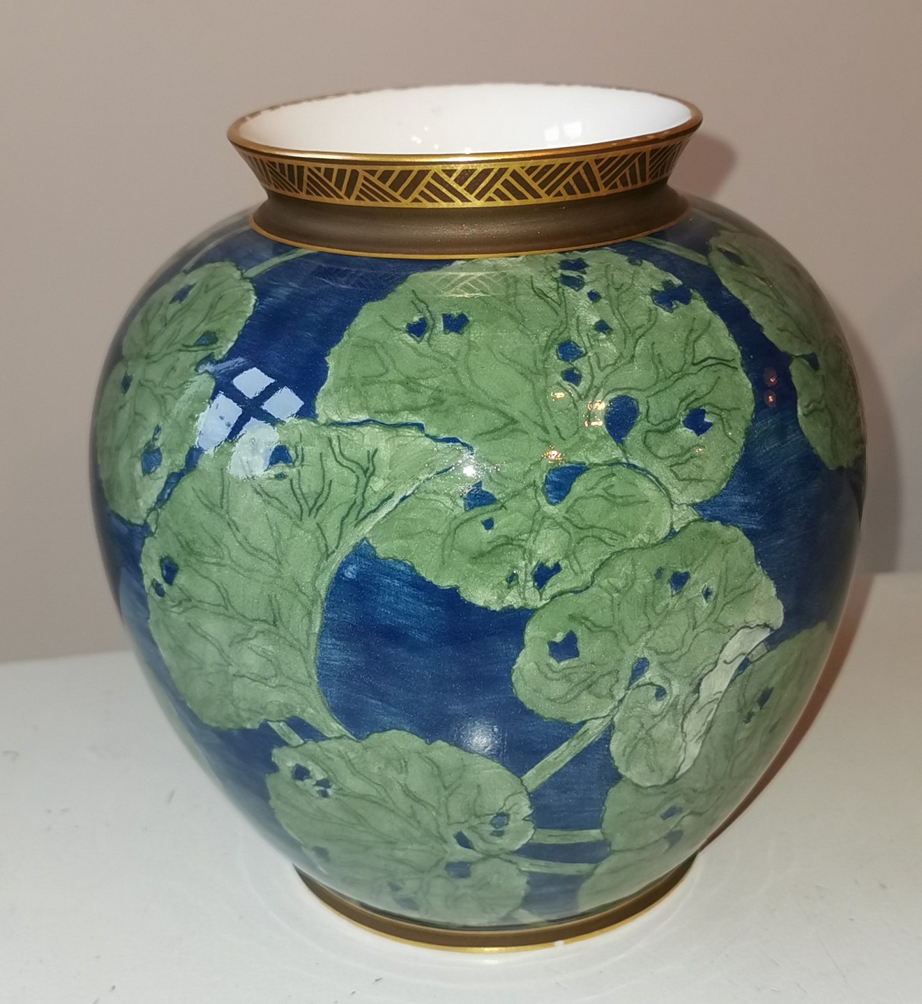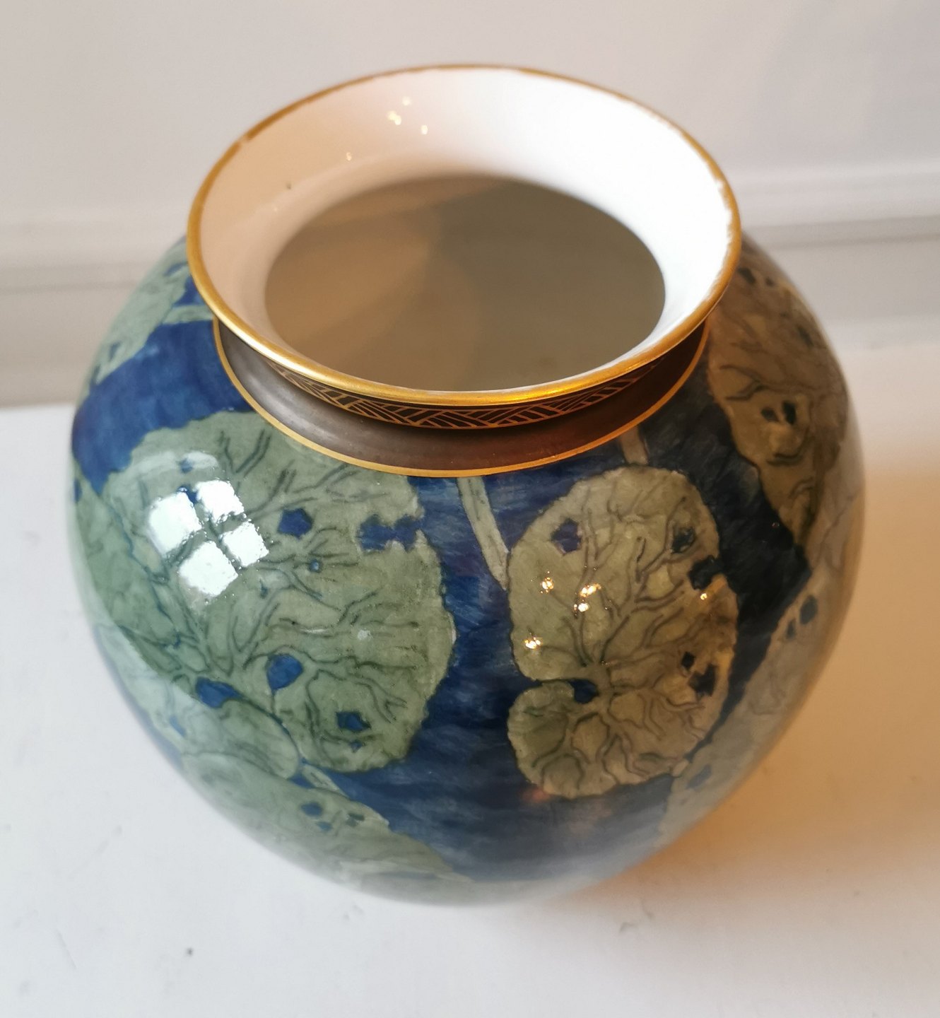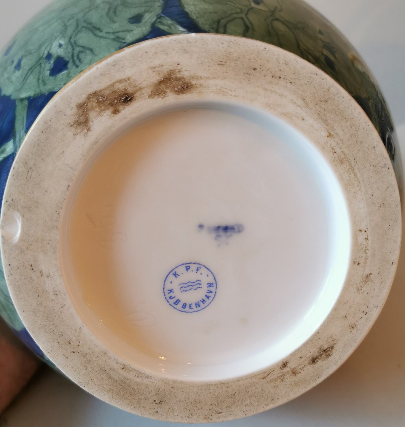 Krukke i porcelæn fra Royal Copenhagen med bemalet dekoration af åkander. Har tre små skår på bundens kant (foto af alle skår). Fabriksmærket på bunden 1880´erne. Mål: H. 22 cm Ø. 21 cm.