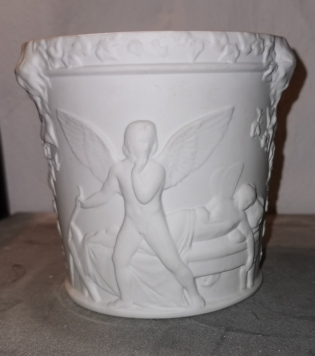 Flower pot in porcelain from Bing & Grondahl. Decorated with two motifs by Bertel Thorvaldsen (1770-1844). 1. "Psyche is approaching with the lamp for sleeping Amor". 2. "Amor leaves the sleeping Psyches sleeping place". Factory mark on the bottom. H. 12 cm