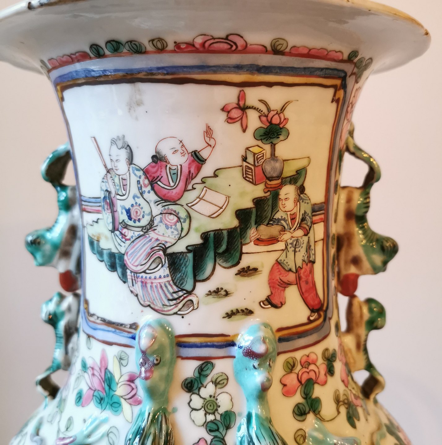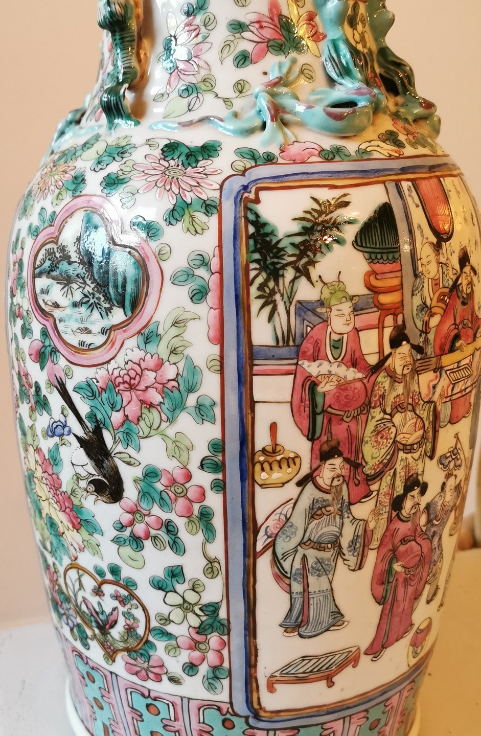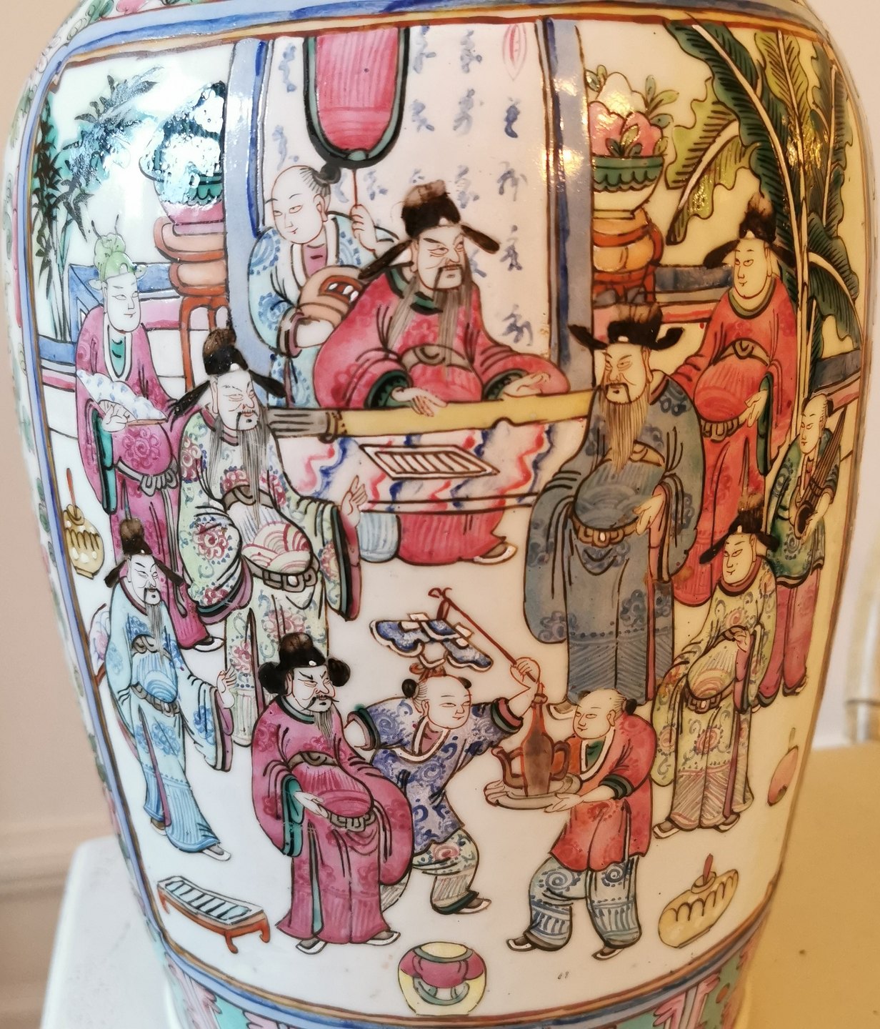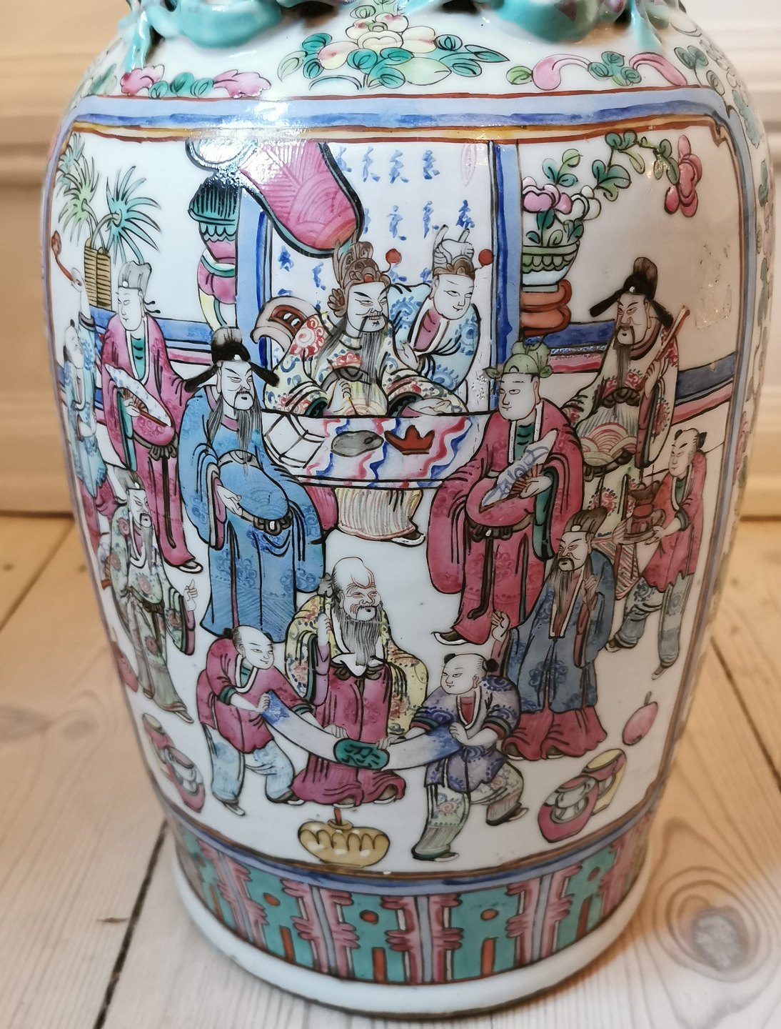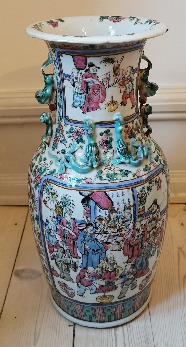Large Chinese floor vase with decoration of figure groups in colourful enamel. Leasing bitches like handle on two sides. Has one smaller cut on the underside - otherwise in good condition. Not the factory mark. Made in the first half of the 20th century. Dimensions: H. 46½ cm