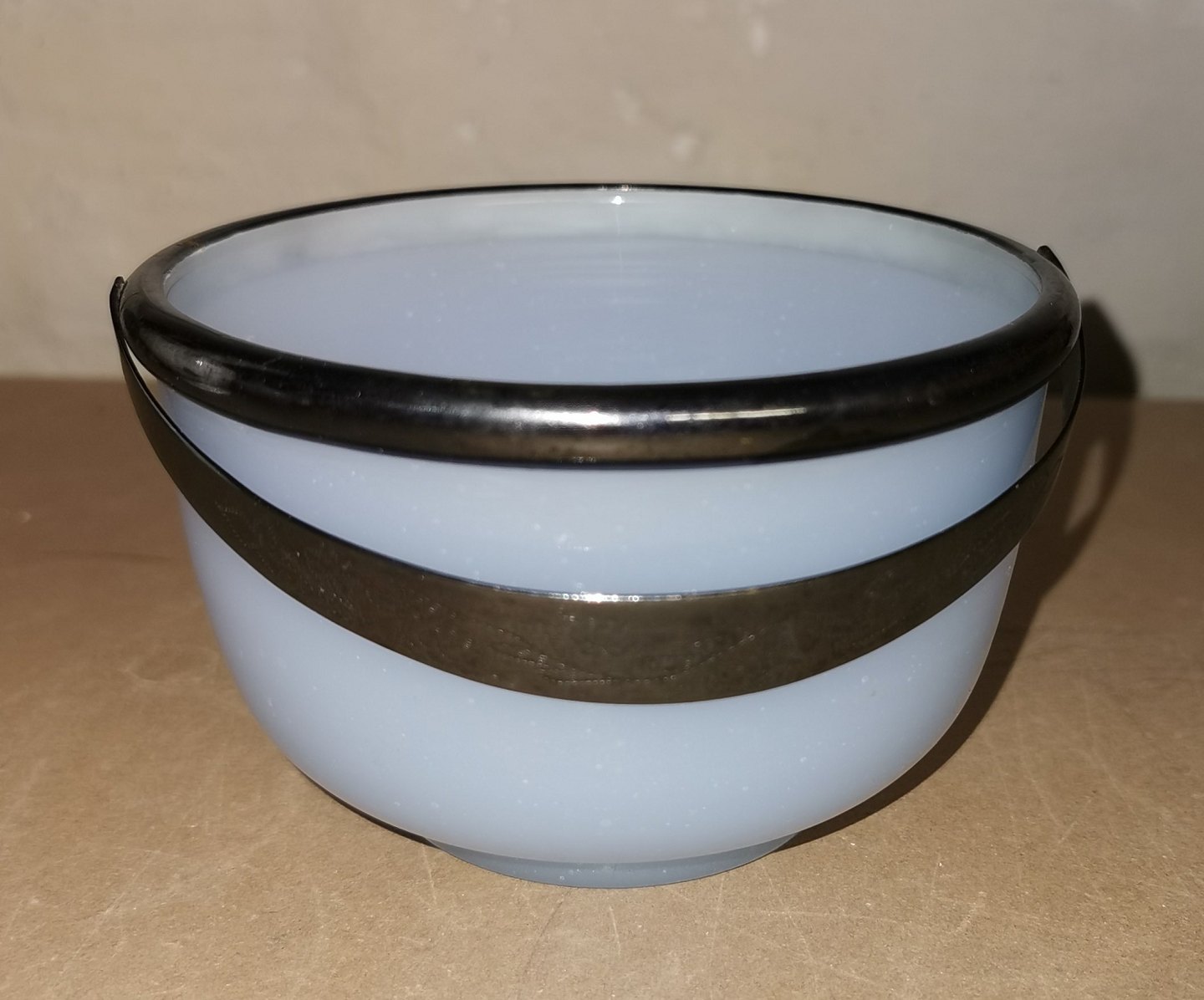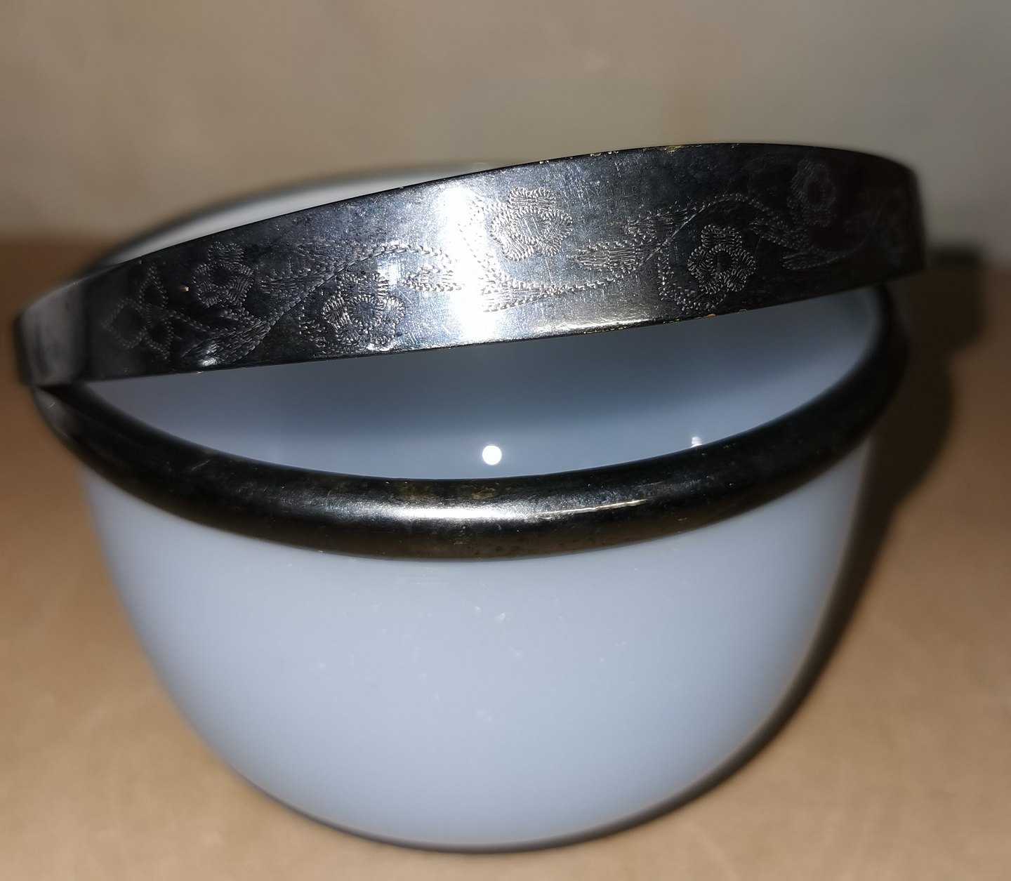 Old 19th century glass: Sugar bowl in light blue opaline glass with silver-plated handle. No damage or repairs. Dimensions: H. 7½ cm Ø. 12 cm.