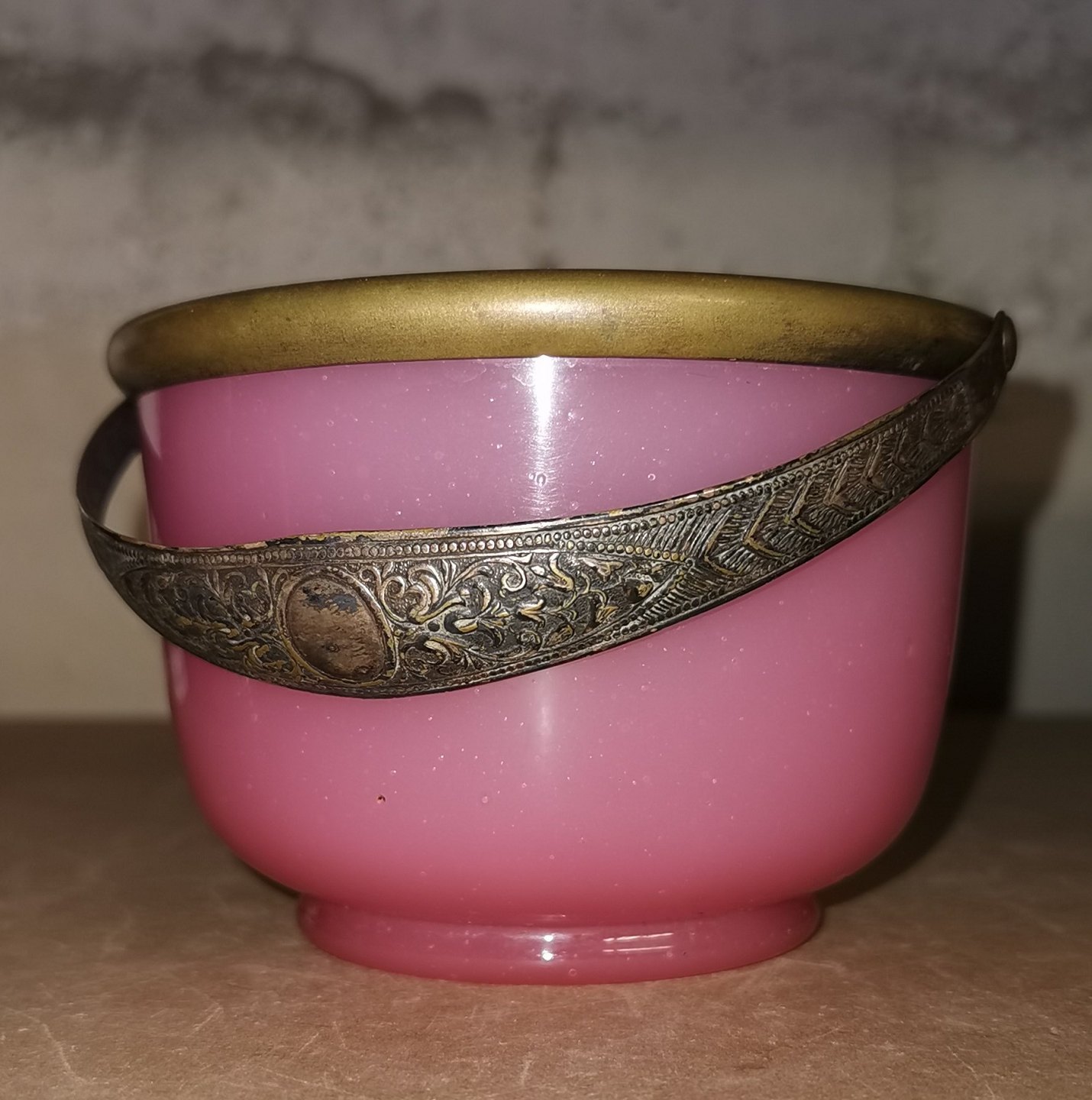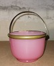 Gammelt glas fra slutningen af 19. århundrede: Sukkerskål i lyserødt opalineglas med monteret hank i sølvplet. Ingen skader eller reparationer. Mål: H. 8 cm Ø. 11½ cm.