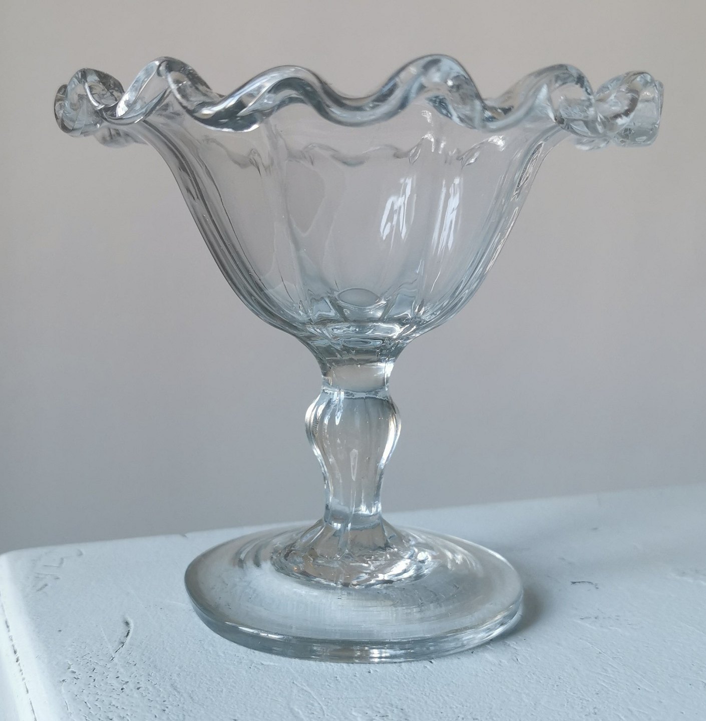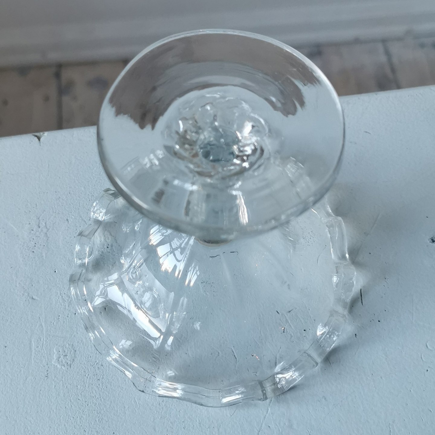 Kandisskål / sukkerskål i klart glas. Bølget og ombukket kant på kummen. Fremstår i perfekt stand. Ingen reparationer. H. 11 cm
