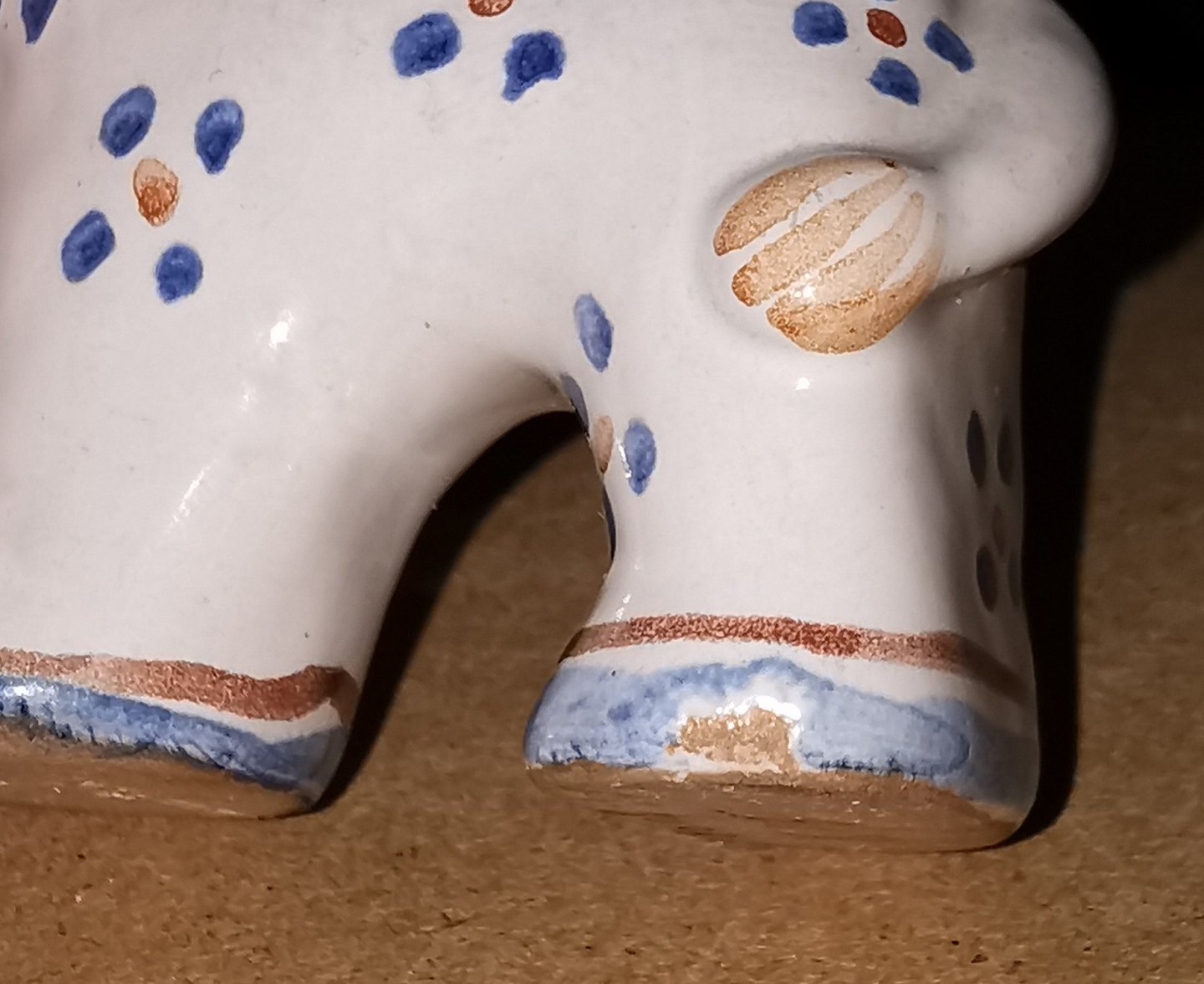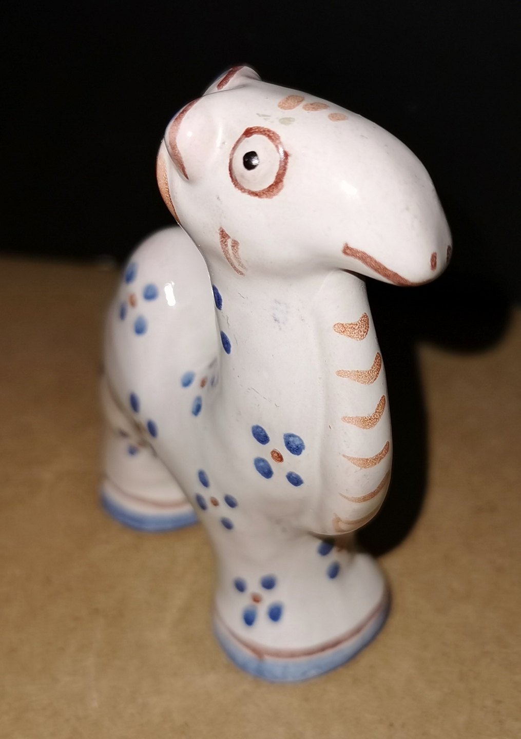 Lauritz Hjorth fabeldyr i form af dromedar. Hvid med plettet dekoration. Mindre glasurmangel på venstre bagben (se foto). Fabriksmærket på bunden. Ingen reparationer. H. 8 cm.